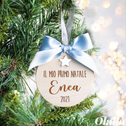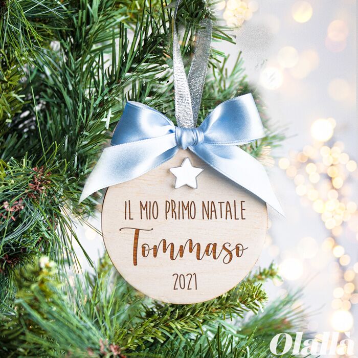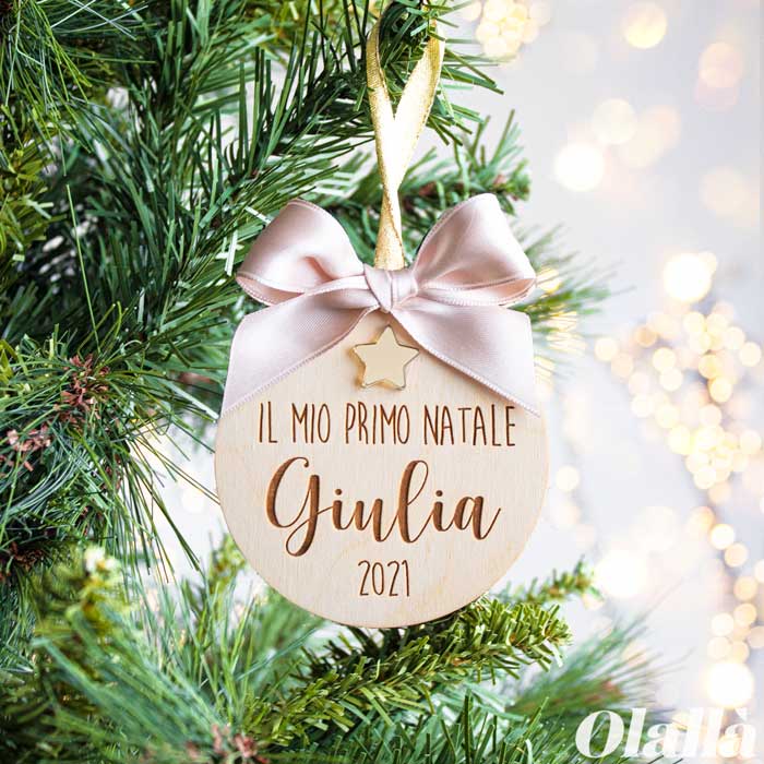 Pallina di Natale per celebrare il Primo Natale del tuo piccolino o piccolina e conservarne per sempre il dolce ricordo. Realizzata in legno e adornata da un fiocco in raso, viene abbellita con una stellina dorata. Disponibile anche nella versione da maschietto, con nastrino celeste e stellina argentata.
