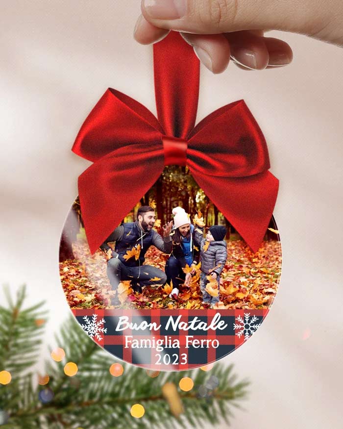 Splendida pallina in plexiglass da appendere all’albero con nome e foto. Puoi far scrivere il nome della famiglia, così da rendere unico e inconfondibile il vostro albero e renderlo ancora più scintillante.