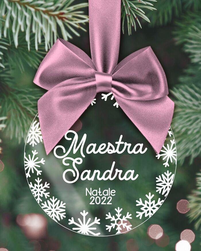 Splendida pallina in plexiglass da appendere all’albero con nome stampato al laser. Puoi scrivere una dolce dedica per la tua maestra. E’ possibile personalizzare la pallina con la dedica che desidera.