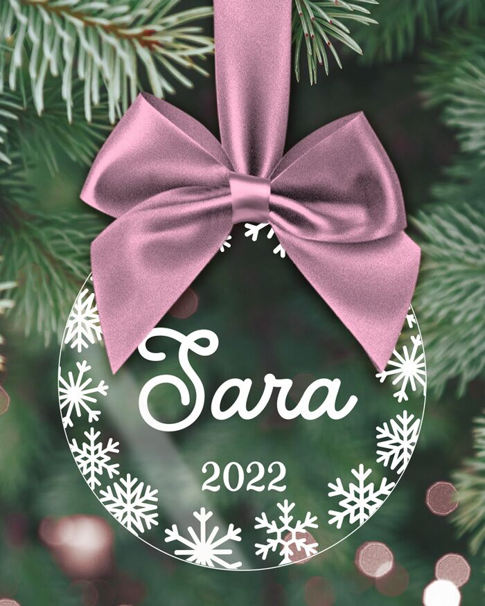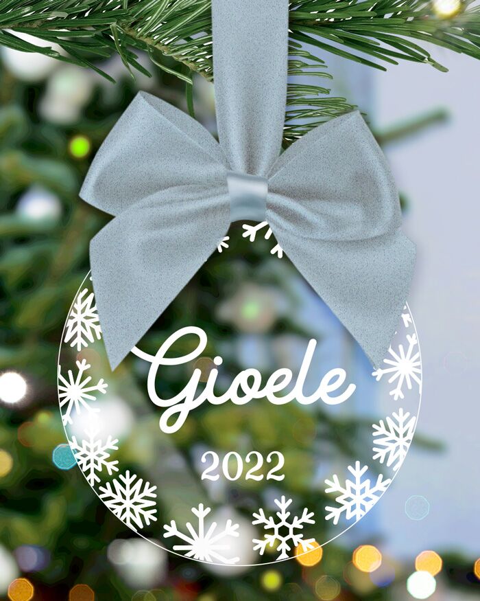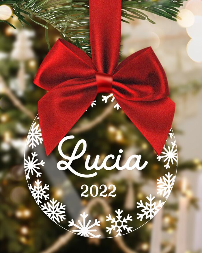 Splendida pallina in plexiglass da appendere all’albero con nome stampato. Puoi far scrivere il nome in corsivo e celebrare in un’atmosfera calda e accogliente il Natale insieme.