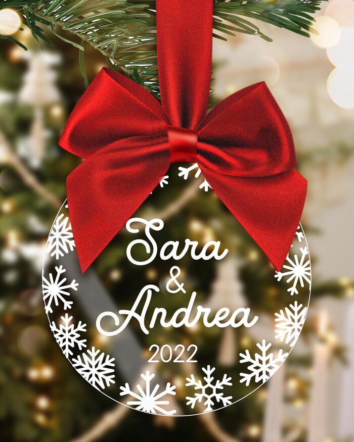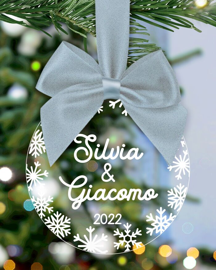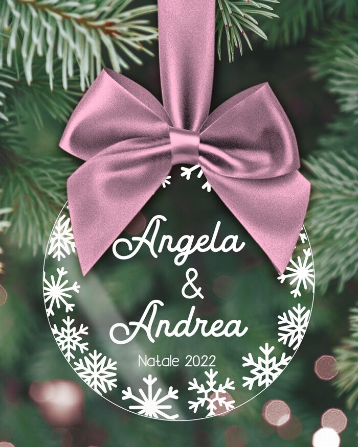 Splendida pallina in plexiglass da appendere all’albero con nome stampato. Puoi scrivere i vostri nomi o i nomi della coppia alla quale regalare questa splendida pallina. É possibile personalizzare la pallina con nomi o dedica.