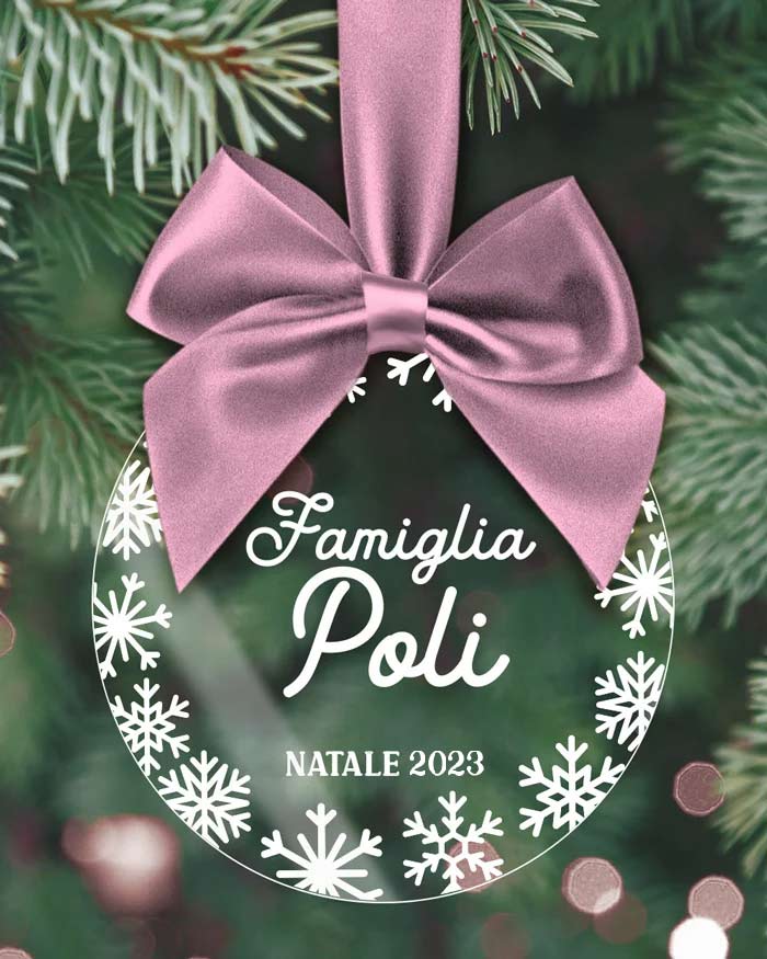 Deliziosa Pallina in Plexiglass con stampa Famiglia, Nome e Fantasia di Fiocchi di Neve. Un modo davvero originale per rendere veramente inimitabile il vostro albero e dando un tocco di personalità in più!