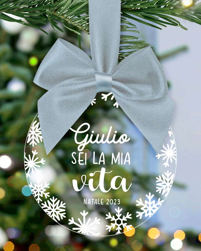 Splendida pallina in plexiglass da appendere all’albero con nome stampato. Puoi far scrivere “Il nostro primo Natale da sposati” e celebrare in un’atmosfera calda e accogliente il vostro primo Natale insieme. La frase che vi proponiamo è “Il nostro primo Natale da sposati” ma la frase è modificabile.