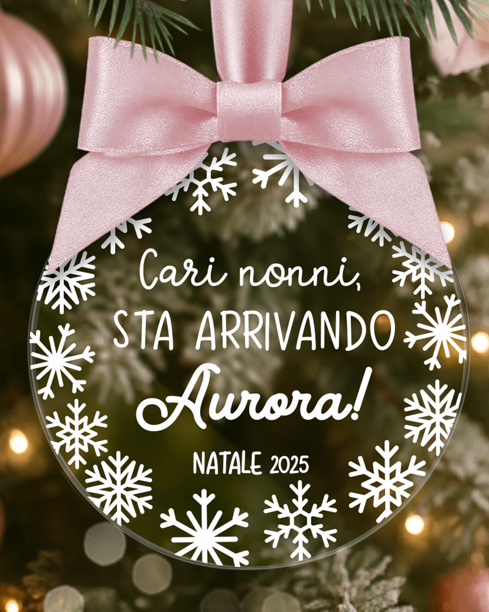Inoltre, potrai selezionare il colore del fiocco in raso, scegliendo tra i toni classici del Natale (rosso, oro, bianco, argento, verde) o tonalità più delicate per un look elegante e sobrio.