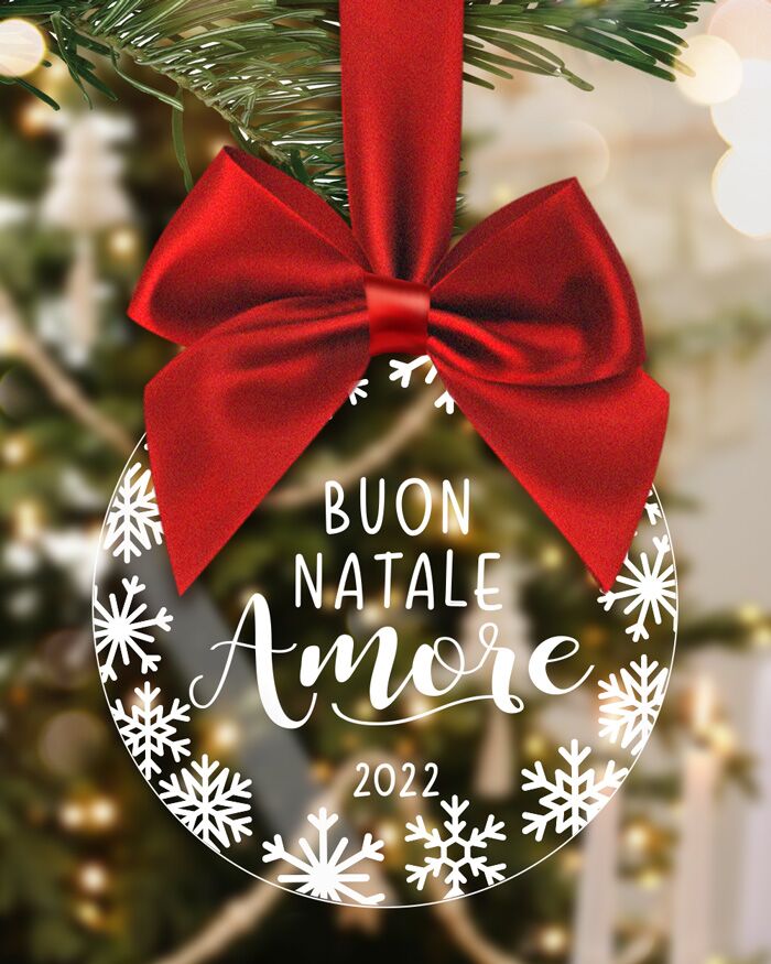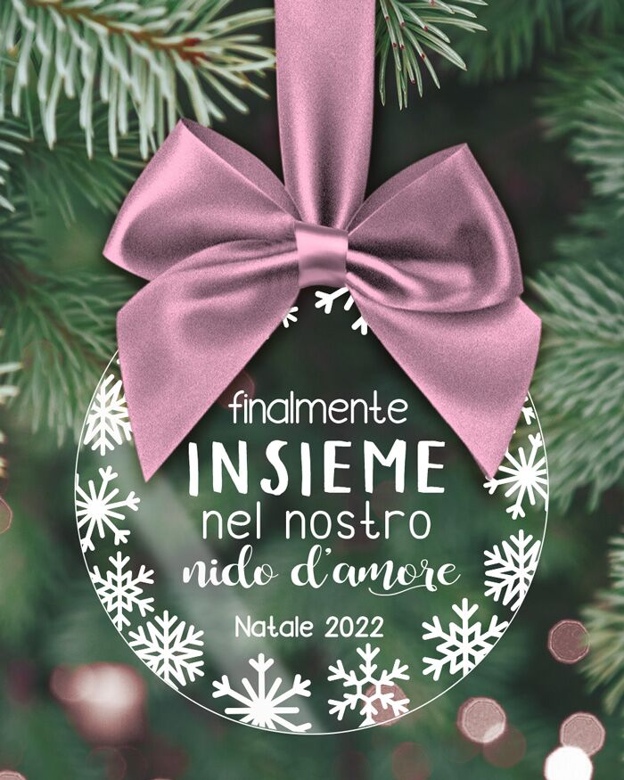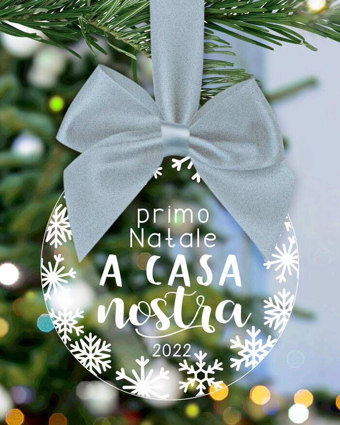 Splendida pallina in plexiglass da appendere all’albero con nome stampato. Puoi scrivere una dolce frase che racconti la vostra prima esperienza natalizia insieme.