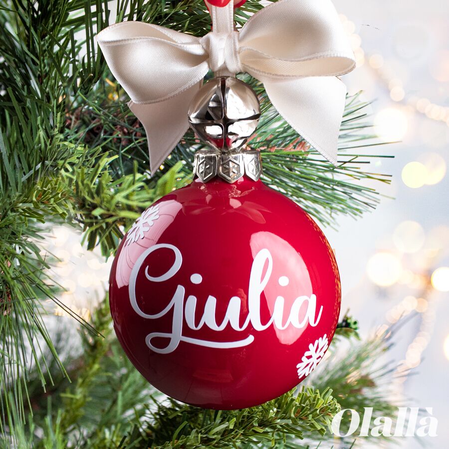 Pallina per Albero di Natale in vetro personalizzata con un nome e delicato decoro di fiocchi di neve. Il campanello con cui è decorata donerà una magica musicalità natalizia al vostro regalo! Un regalo bello, elegante e prezioso per chiunque ami di più!