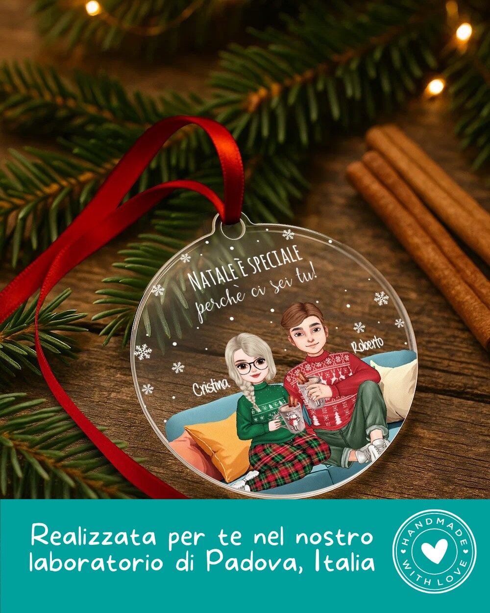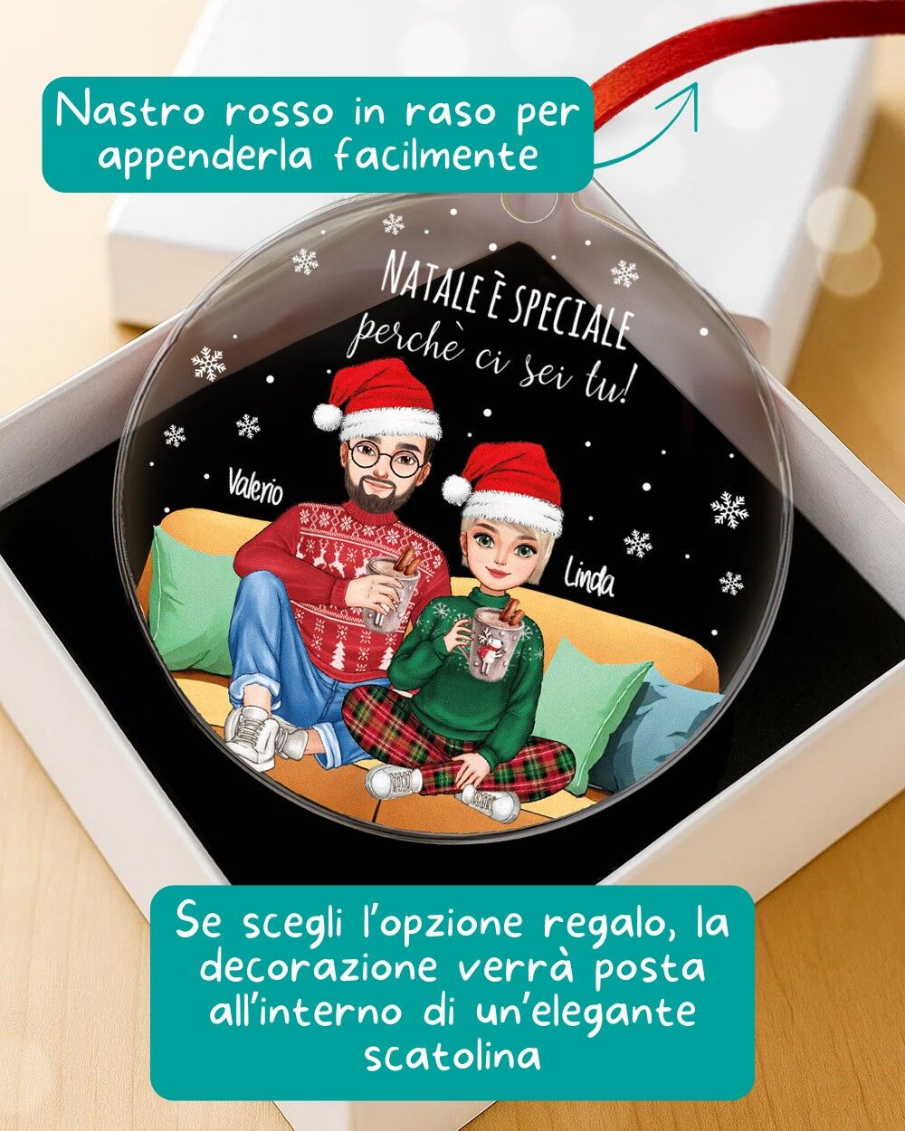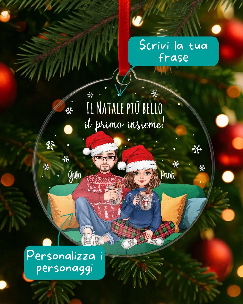 Una decorazione allegra e tenera che ritrae una coppia seduta sul divano, disegnata in stile cartoon e completamente personalizzabile: scegli i dettagli, i nomi e la dedica per creare una pallina di Natale personalizzata che racconta la vostra storia d’amore.