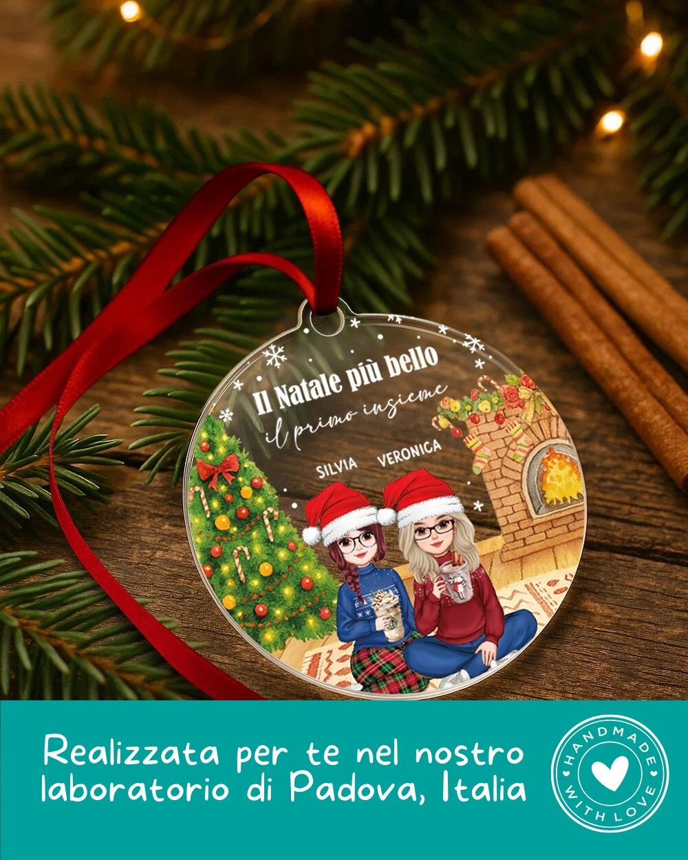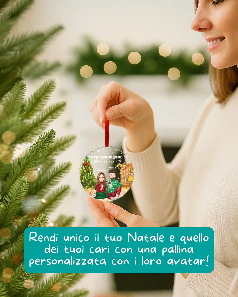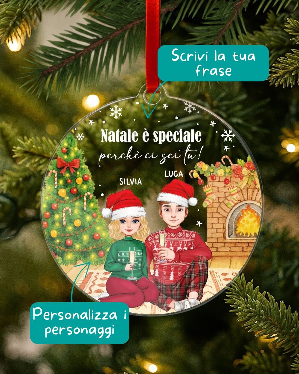 Una pallina di Natale personalizzata che racconta la tua storia e quella di chi ami, perfetta come idea regalo Natale coppia per celebrare l’amore e la complicità durante le feste.
