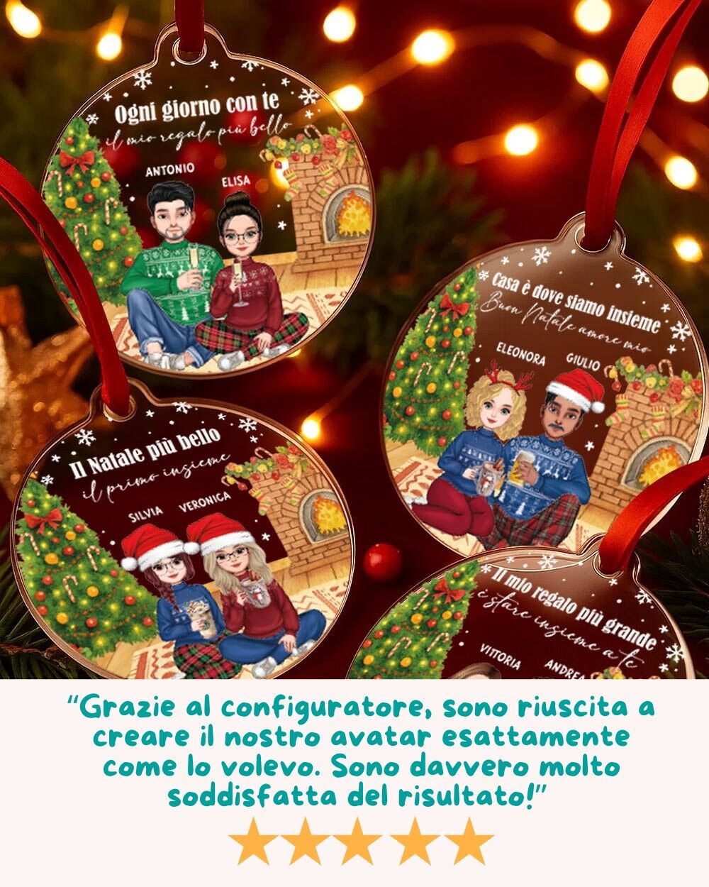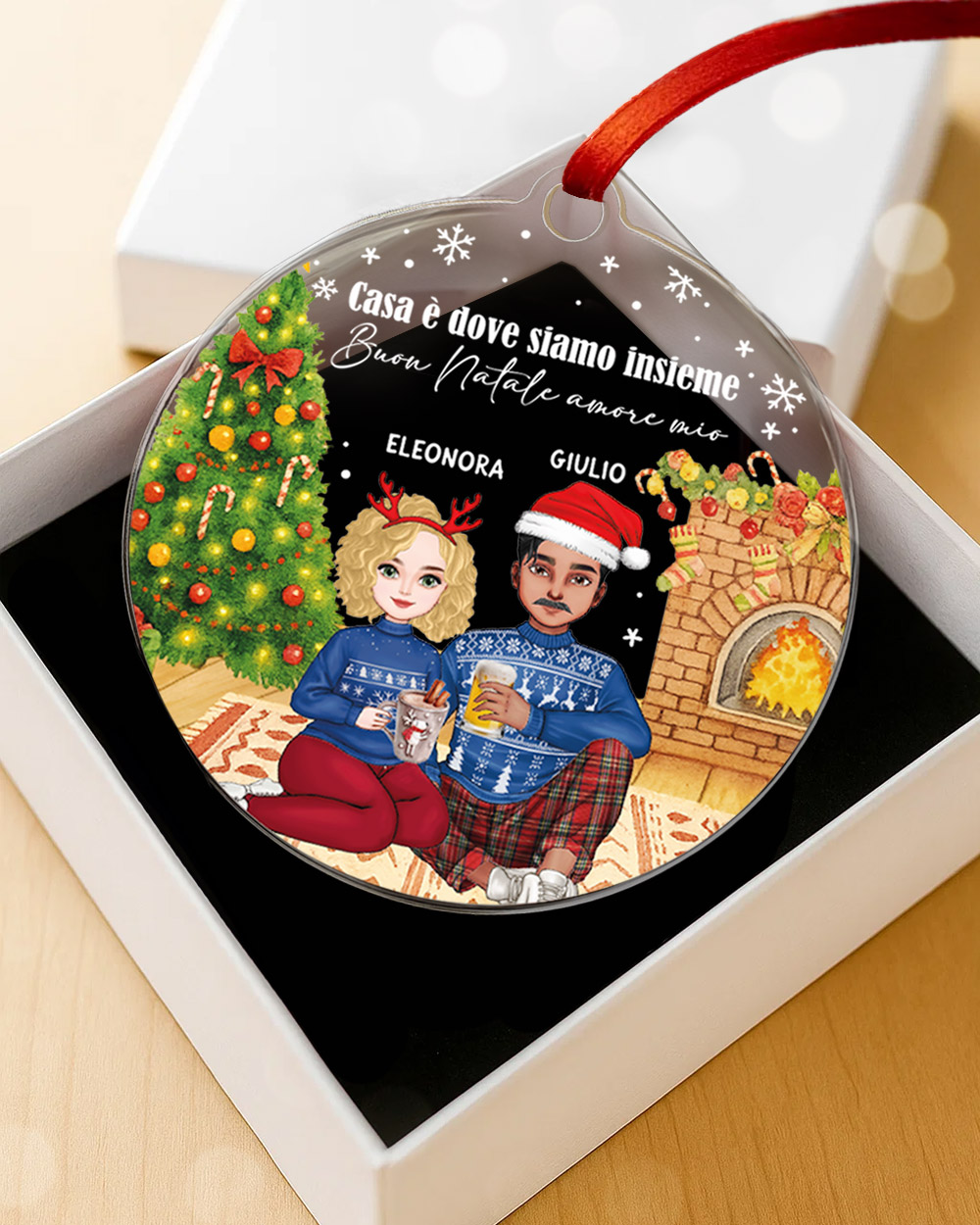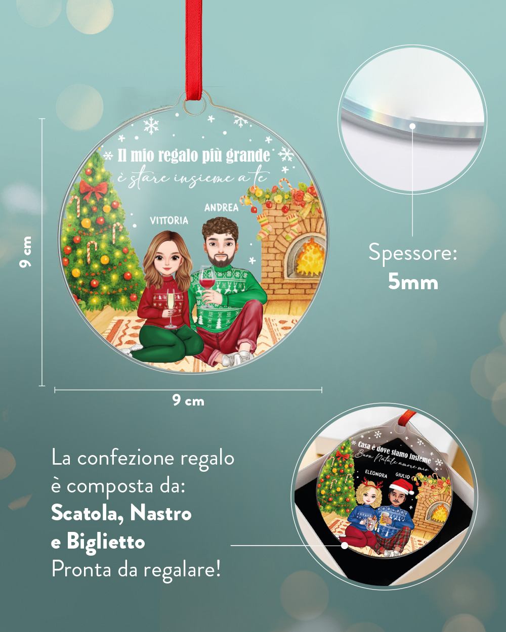 Un addobbo romantico, tenero e divertente che raffigura una coppia davanti al caminetto e all’albero di Natale, personalizzata nei minimi dettagli: dal colore dei capelli agli abiti, dagli accessori alla dedica finale.