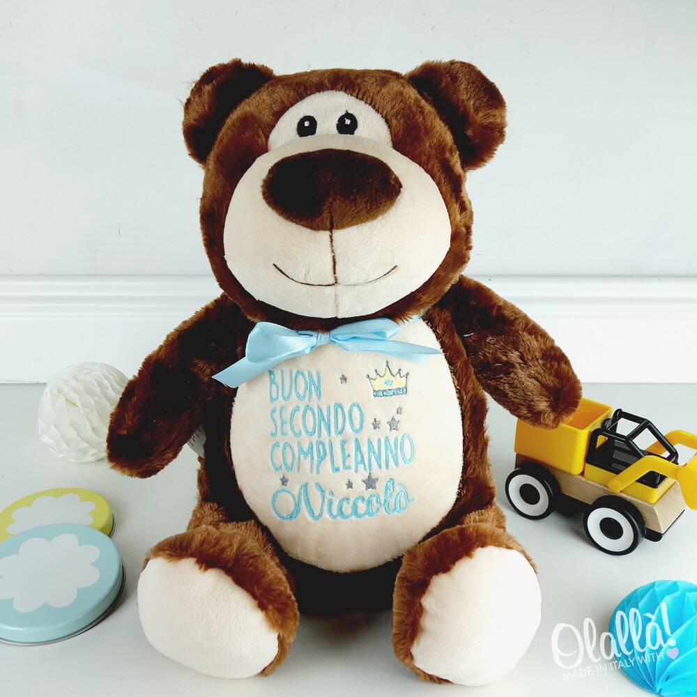 Morbidissimo peluche con ricamo personalizzabile “Buon secondo Compleanno” e il nome del bambino. Realizzate un regalo davvero originale per un bambino speciale. Stupite i genitori e lasciate che il piccolo si ricordi sempre di voi ogni volta che stringerà a sé questo meraviglioso pupazzo. Scritta e colori a scelta.
