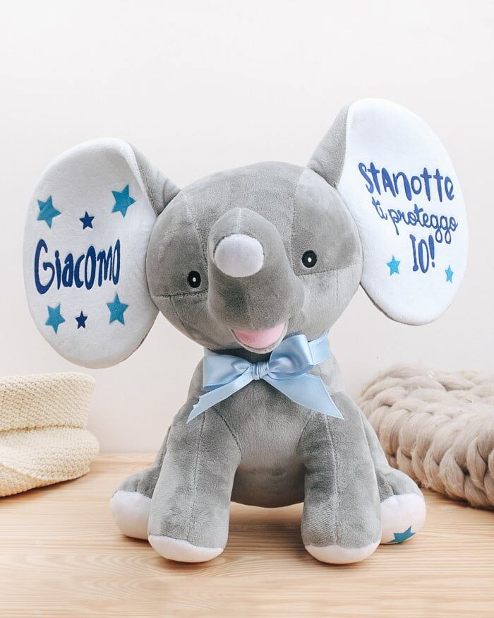 Dolcissimo peluche elefantino personalizzato con la stampa del nome del bimbo o la bimba che lo riceverà e una tenera dedica. Un’idea regalo unica e originale per celebrare il lieto evento della nascita. Stampa a scelta nei toni del rosa o dell’azzurro. Regala un amico morbido e coccoloso al piccolo o piccola di casa, sarà un ricordo che potrà conservare per sempre!