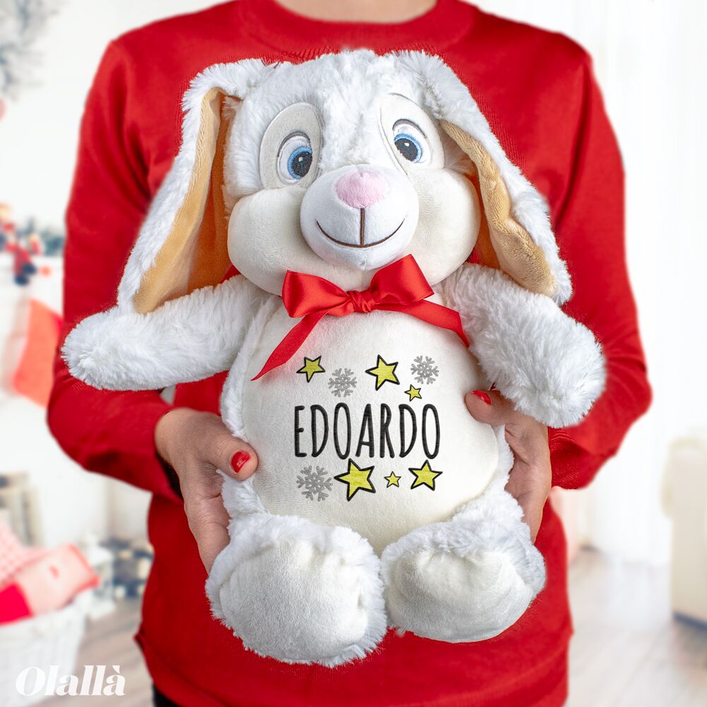 Morbidissimo peluche con fiocco, abbellito da bellissime decorazioni natalizie sul pancino e personalizzabile col ricamo del nome del piccolino a cui lo vuoi regalare. Un regalo natalizio dolcissimo con cui giocare e condividere i momenti più belli!