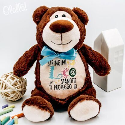 Adorabile peluche con fiocco, ricamato sul pancino con il nome del bambino e la frase “Stringimi, stanotte ti proteggo io” Un regalo dolcissimo che farà sciogliere di tenerezza la neo mamma e un simpatico amico che farà compagnia al piccolo nella culla.