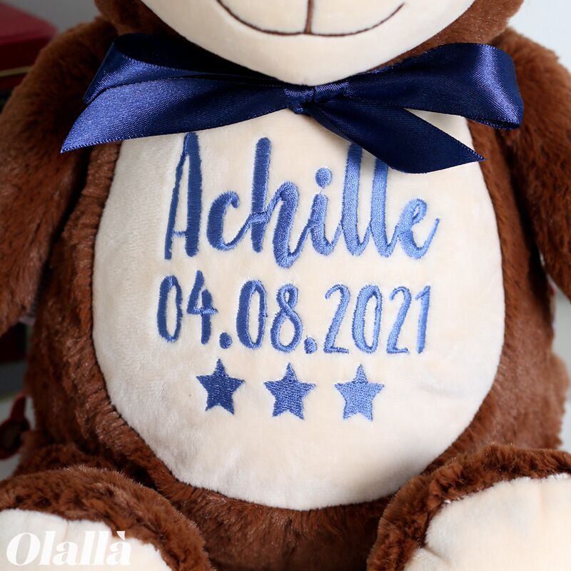 Tenerissimo peluche personalizzato con il ricamo del nome e della data di nascita sul pancino. Un’idea regalo originale per celebrare l’arrivo di un nuovo bebè o un battesimo. Ricamo a scelta in versione da femminuccia o maschietto.