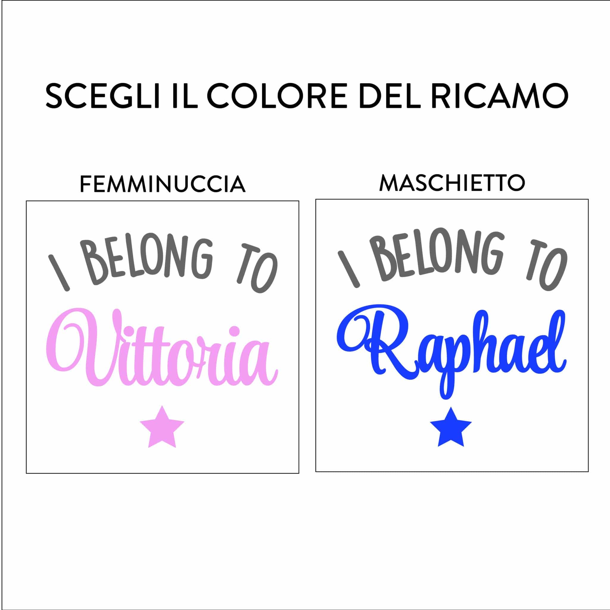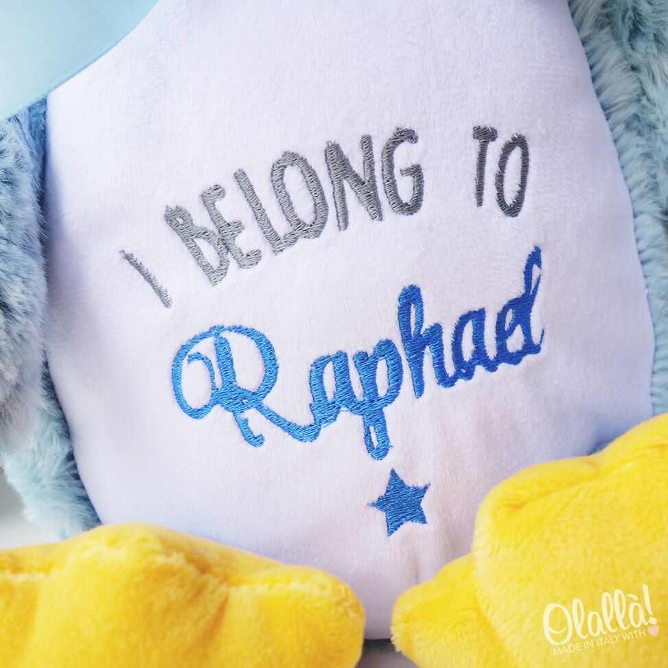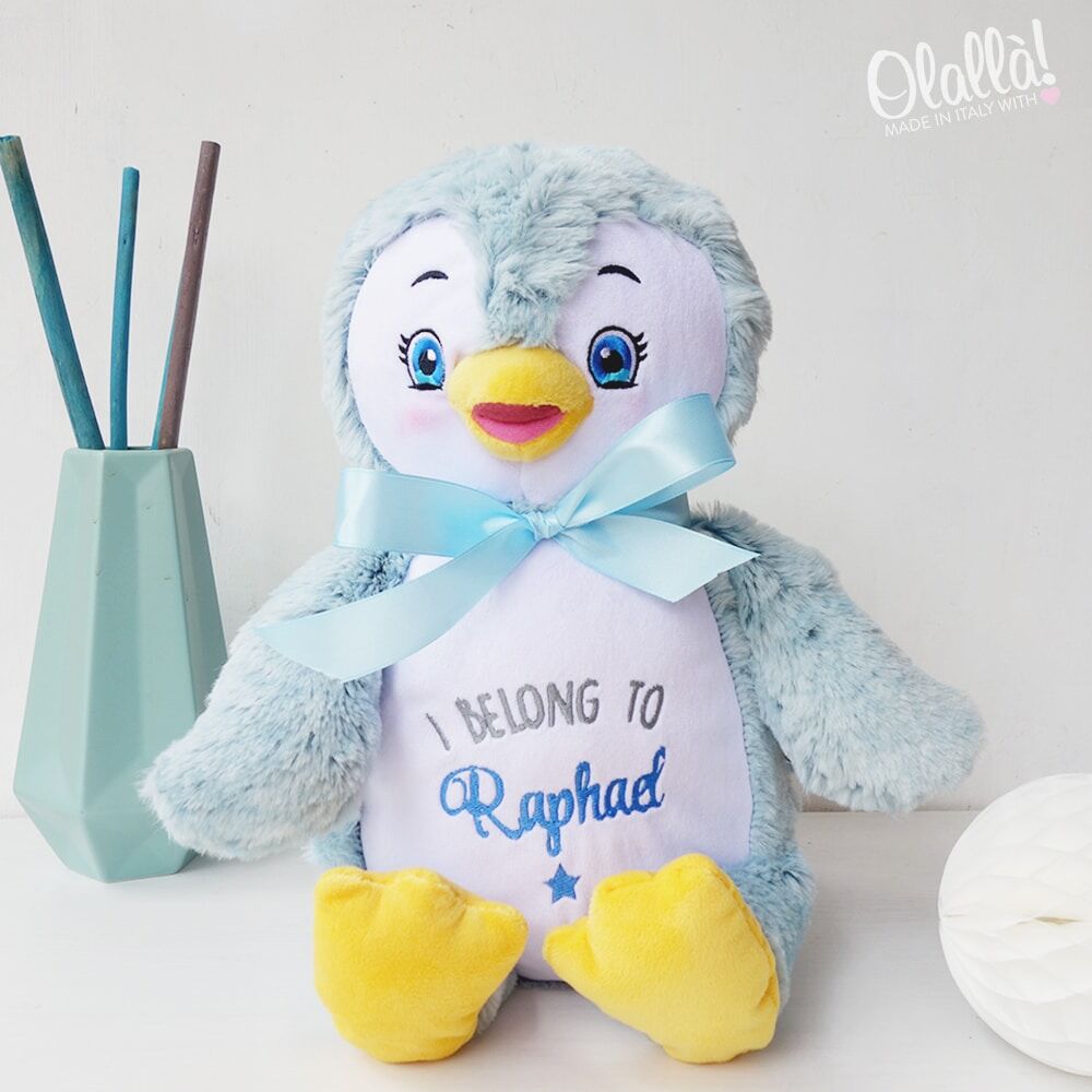 Simpatico pinguino azzurro con fiocco e con scritta che dice “I belong to”, in italiano “Appartengo a”, personalizzabile col nome del bambino. Un regalo dolcissimo con cui giocare e condividere i momenti più belli.