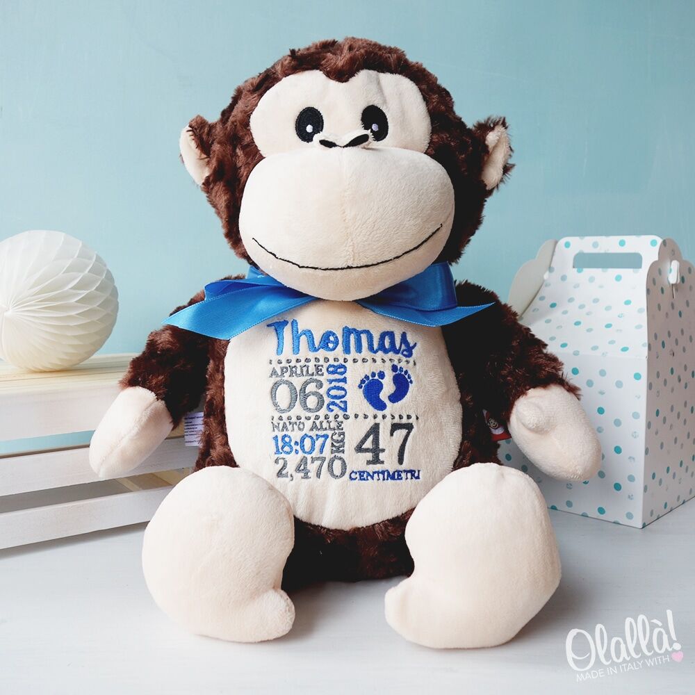 Scimmietta di peluche con fiocco azzurro personalizzata con nome, peso, centimetri, data e orario di nascita. Un’idea regalo unica e originale che accompagnerà il piccolo nella sua crescita.