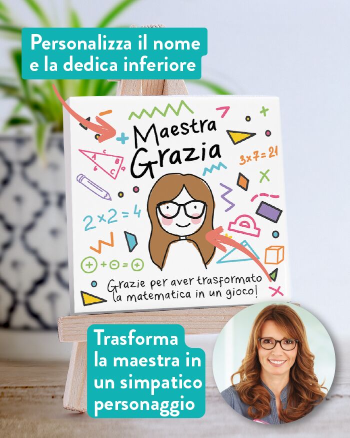 Se stai cercando un’idea regalo significativa per la maestra di matematica, non cercare oltre! Sorprendila con un regalo che riflette il suo amore per i numeri e le figure geometriche! La nostra piastrella in ceramica personalizzata è un dono unico e speciale che le farà capire quanto sia stata importante per i vostri bambini durante l’anno scolastico che sta per concludersi. Così la maestra potrà sfoggiare la sua piastrella personalizzata che terrà con orgoglio sulla sua cattedra, un vero e proprio oggetto d’arredo bello ed originale!