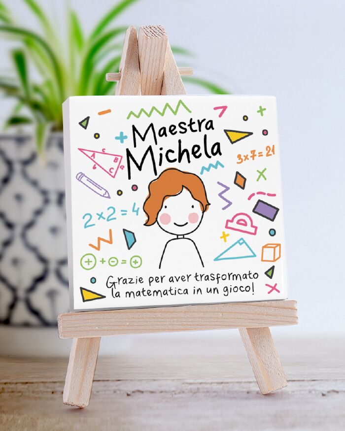 Simpatica Piastrella in ceramica montata su un cavalletto in legno e personalizzata con la tua maestra di Matematica stilizzata con nome e dedica che preferisci.