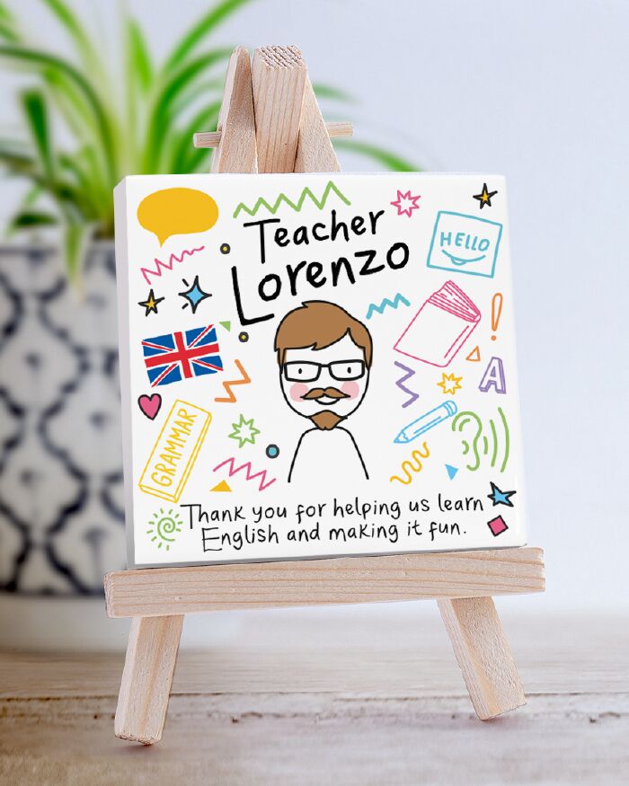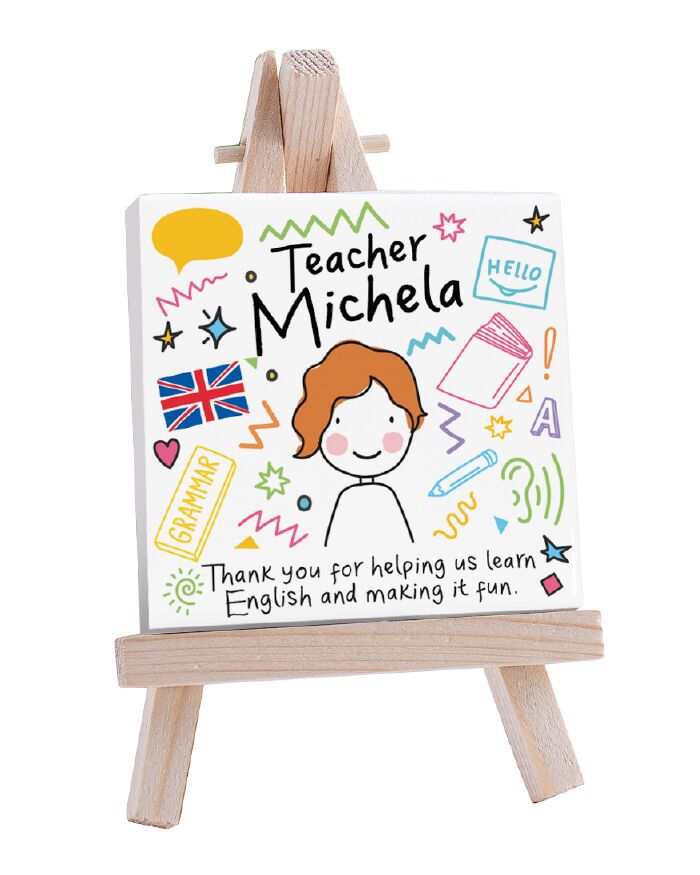 Simpatica Piastrella in ceramica montata su un cavalletto in legno e personalizzata con la tua maestra d’inglese stilizzata con nome e dedica che preferisci.