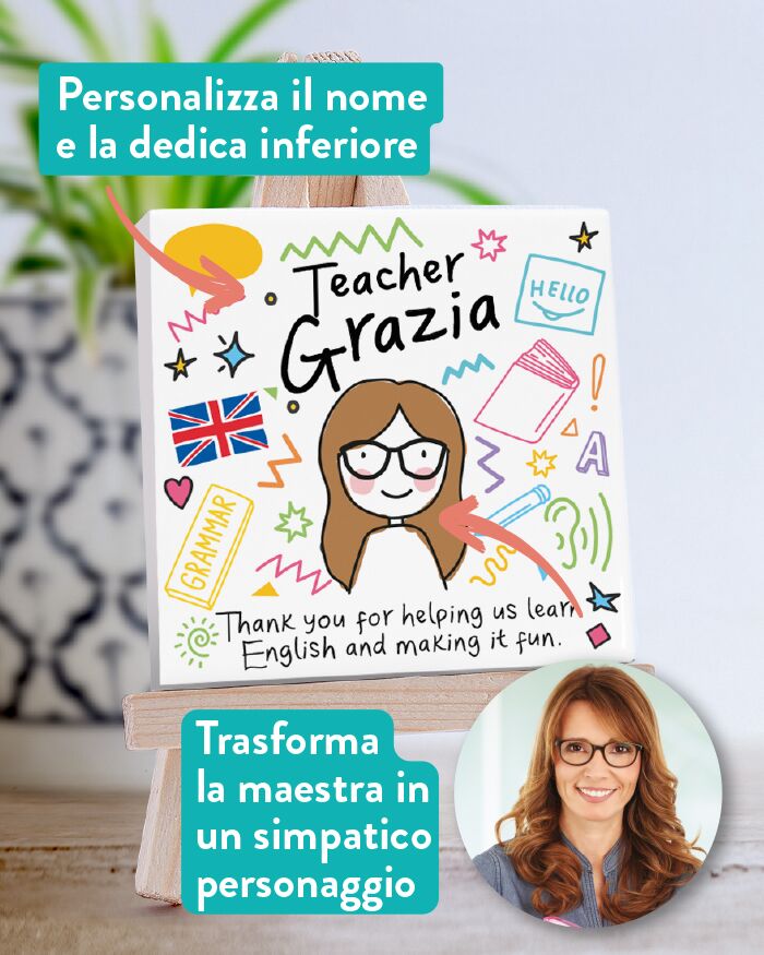 Imparare l’inglese da piccoli è un gioco da ragazzi se a insegnarlo c’è la maestra giusta, anzi la teacher! Tra canzoni, scioglilingua e tante flashcards da colorare la maestra d’inglese sa come far breccia nel cuore dei più piccoli, ed è per questo che un regalo di ringraziamento è proprio quello che ci vuole! Così la teacher potrà sfoggiare la sua piastrella personalizzata che terrà con orgoglio sulla sua cattedra, un vero e proprio oggetto d’arredo bello ed originale!