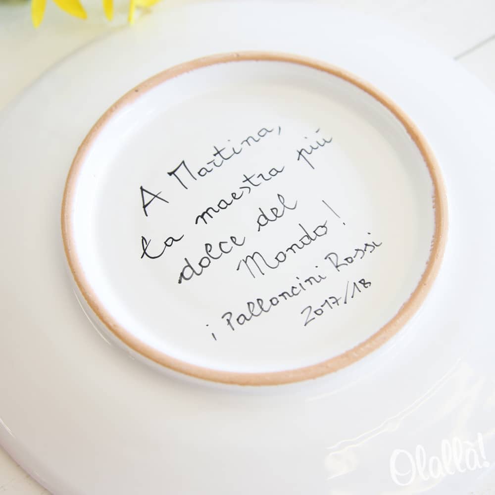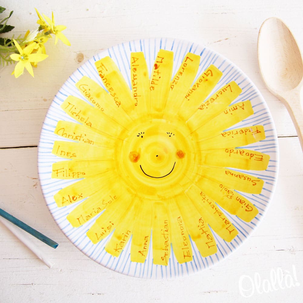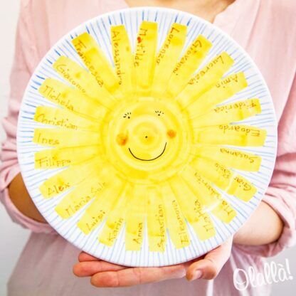 Splendido piatto decorativo in ceramica dipinto a mano, personalizzabile secondo le vostre esigenze. Come da proposta, inserendo nei raggi del sole i nomi degli alunni della classe, e la dedica sul retro, può essere un’originalissima idea regalo di fine anno per le vostre dolci maestre!
