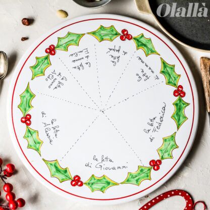 Il piatto da torta è pensato per essere personalizzato con la divisione in fette di torta di varie grandezze, in modo da poter assegnare a ciascuno la sua fetta, piccola, media o grande. Rimane invece invariata la decorazione con le foglie e bacche di vischio.