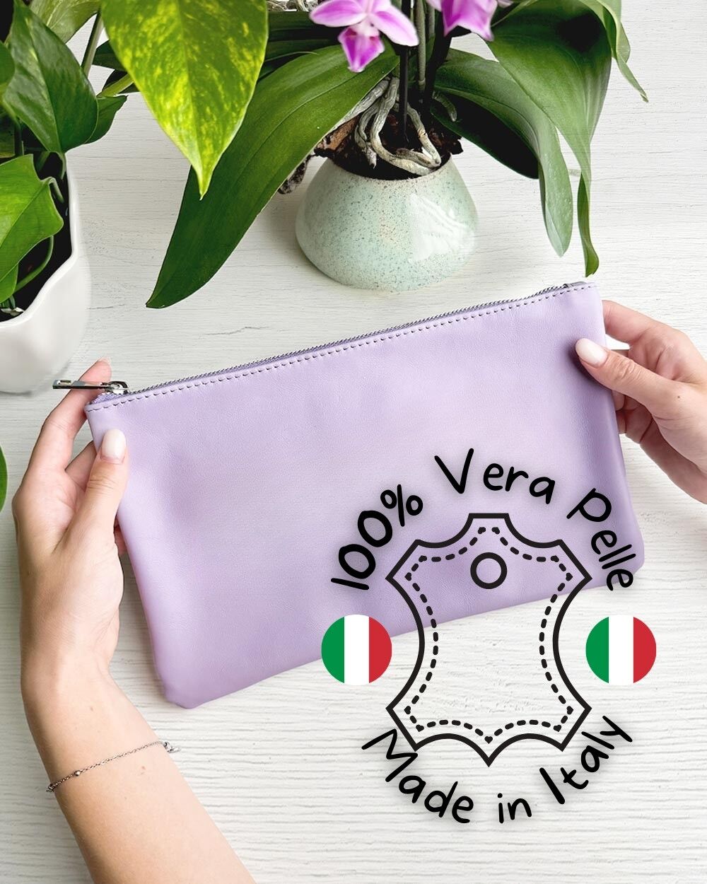 Questa pochette in vera pelle Made in Italy è l’accessorio perfetto per chi ama coniugare praticità ed eleganza. Realizzata artigianalmente con pellame di alta qualità, è disponibile in versione piccola o grande e in diversi colori, per adattarsi a ogni occasione e stile personale. Il suo design minimalista e raffinato la rende ideale da portare a mano nelle serate speciali o da utilizzare come pratico portaoggetti all’interno della borsa. Un dettaglio di classe senza tempo, capace di valorizzare ogni look.