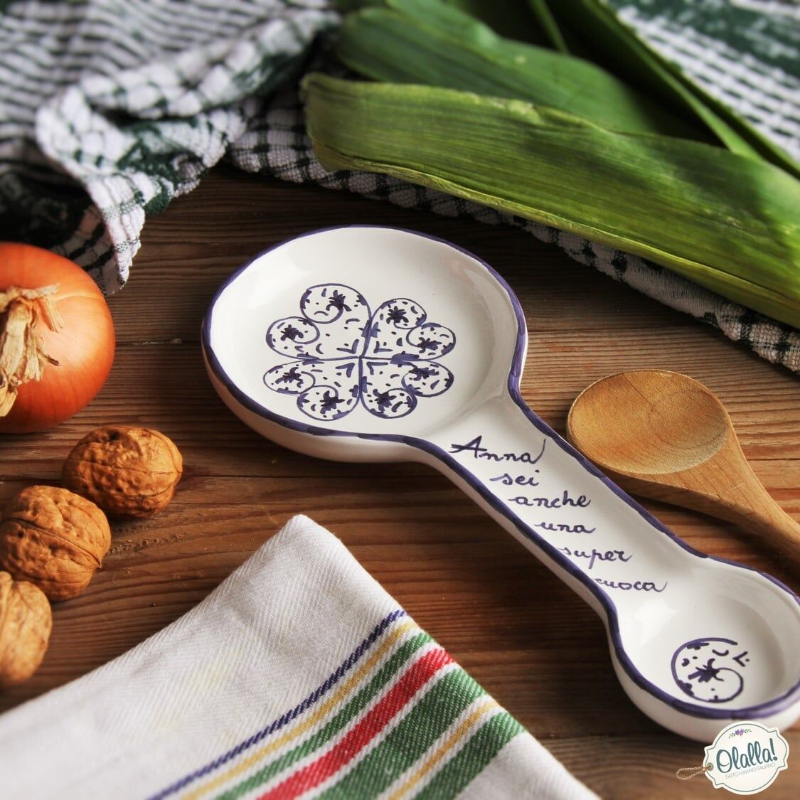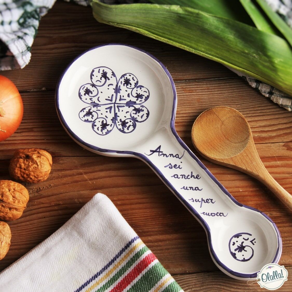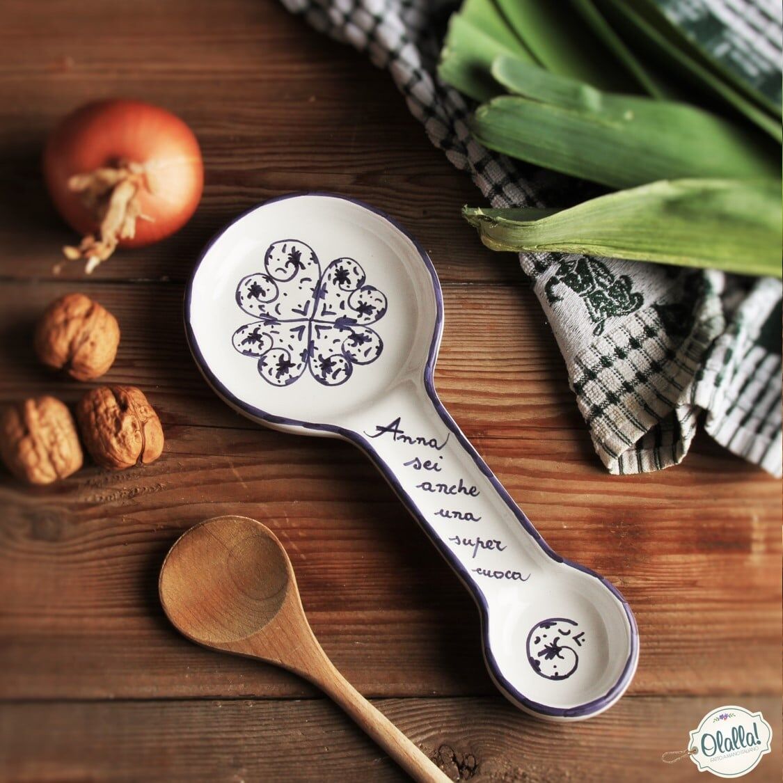Elegante poggia cucchiaio grande dipinto a mano con classico decoro bianco e blu (potete comunque scegliere il colore del decoro tra quelli proposti nella Galleria Immagini). E’ pensato per essere personalizzato con l’aggiunta di una frase (nell’esempio, “Anna! Sei anche una super cuoca”), che potete indicare liberamente. Per una parente o un’amica che in cucina è una vera regina, ecco un’idea regalo ideale che troverà anche sicuramente utile!
