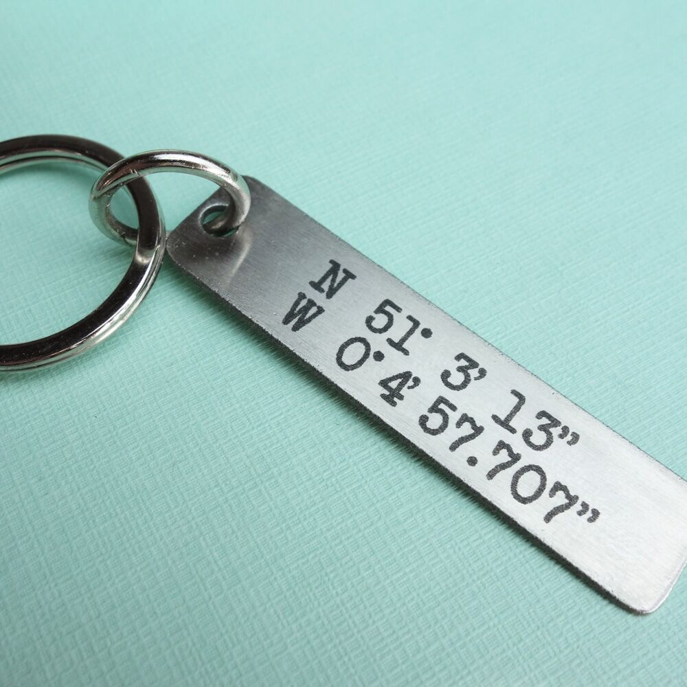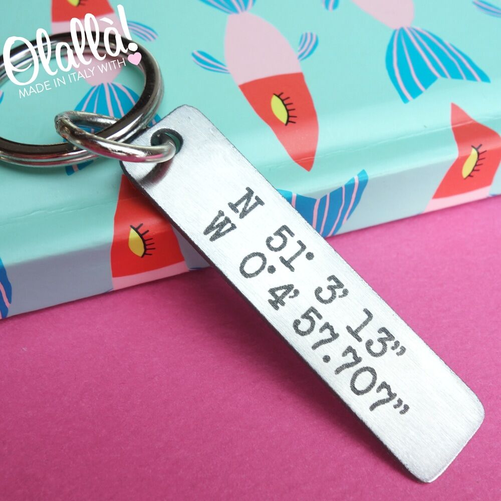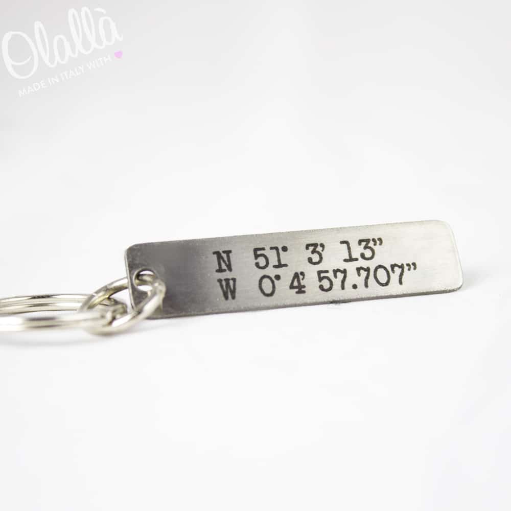 Portachiavi in acciaio inox inciso a mano con le coordinate geografiche del vostro luogo d’amore. Per renderlo unico e speciale, puoi personalizzare il portachiavi indicando nelle sezioni apposite le coordinate specifiche di un luogo che vi sta particolarmente a cuore, ottimo anche come idea regalo. La targhetta personalizzata può inoltre essere utilizzata non solo come portachiavi, ma anche come ciondolo da appendere a una catenina o a un bracciale.