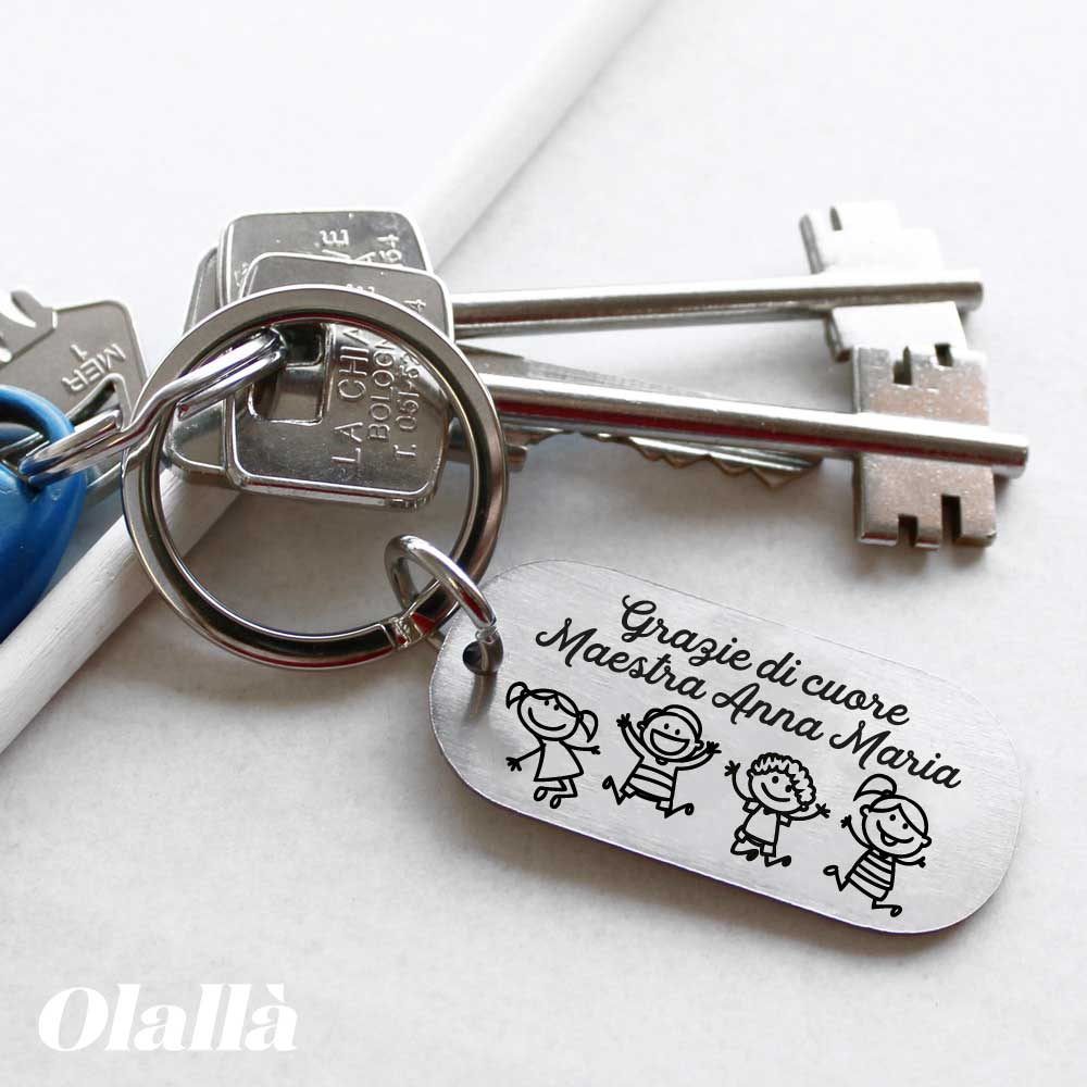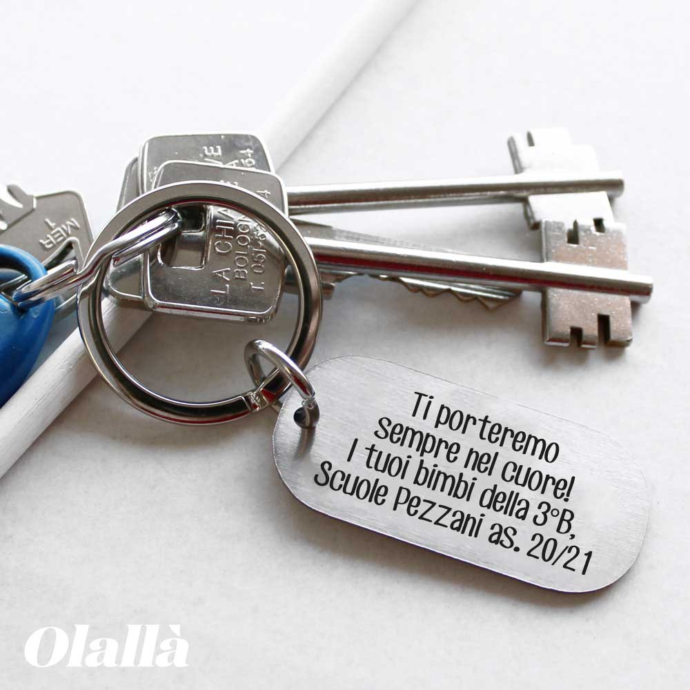 Splendido portachiavi in acciaio inox personalizzabile con incisione nera sia fronte che retro (costo extra).