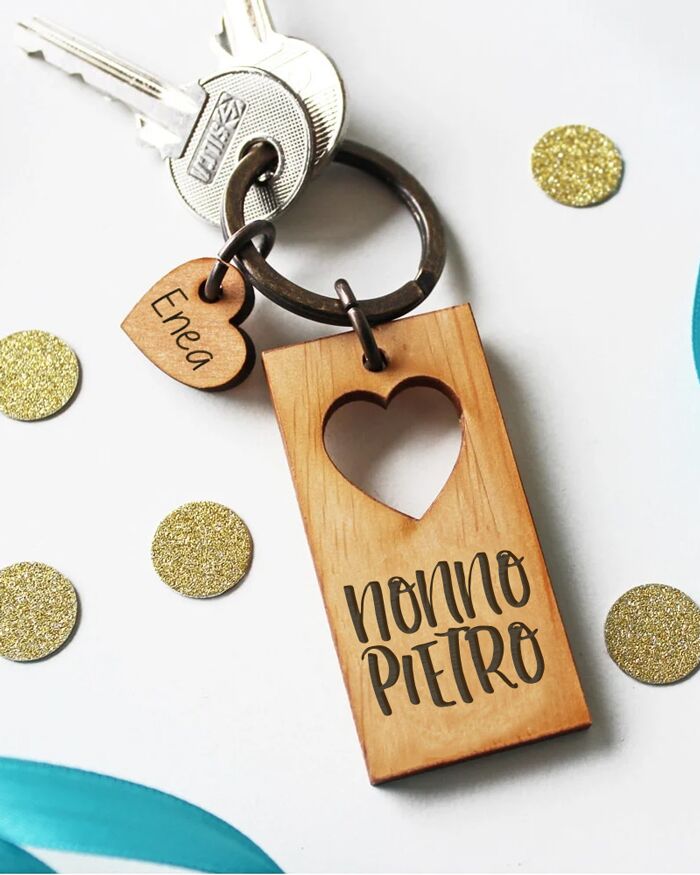 Meraviglioso portachiavi in legno rettangolare con l’incisione per il nonno e dei teneri cuoricini con i nomi dei suoi nipotini. L’incisione è personalizzabile a proprio piacimento, si può aggiungere una dedica sul retro. Una dolcissima idea regalo per la Festa dei nonni: emozionatelo in modo unico!