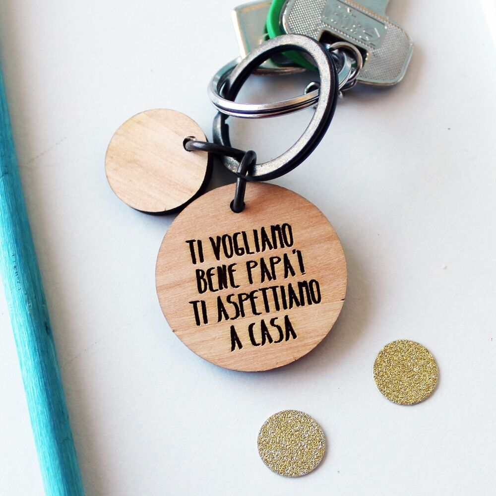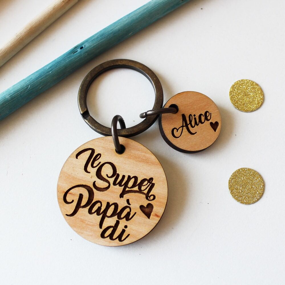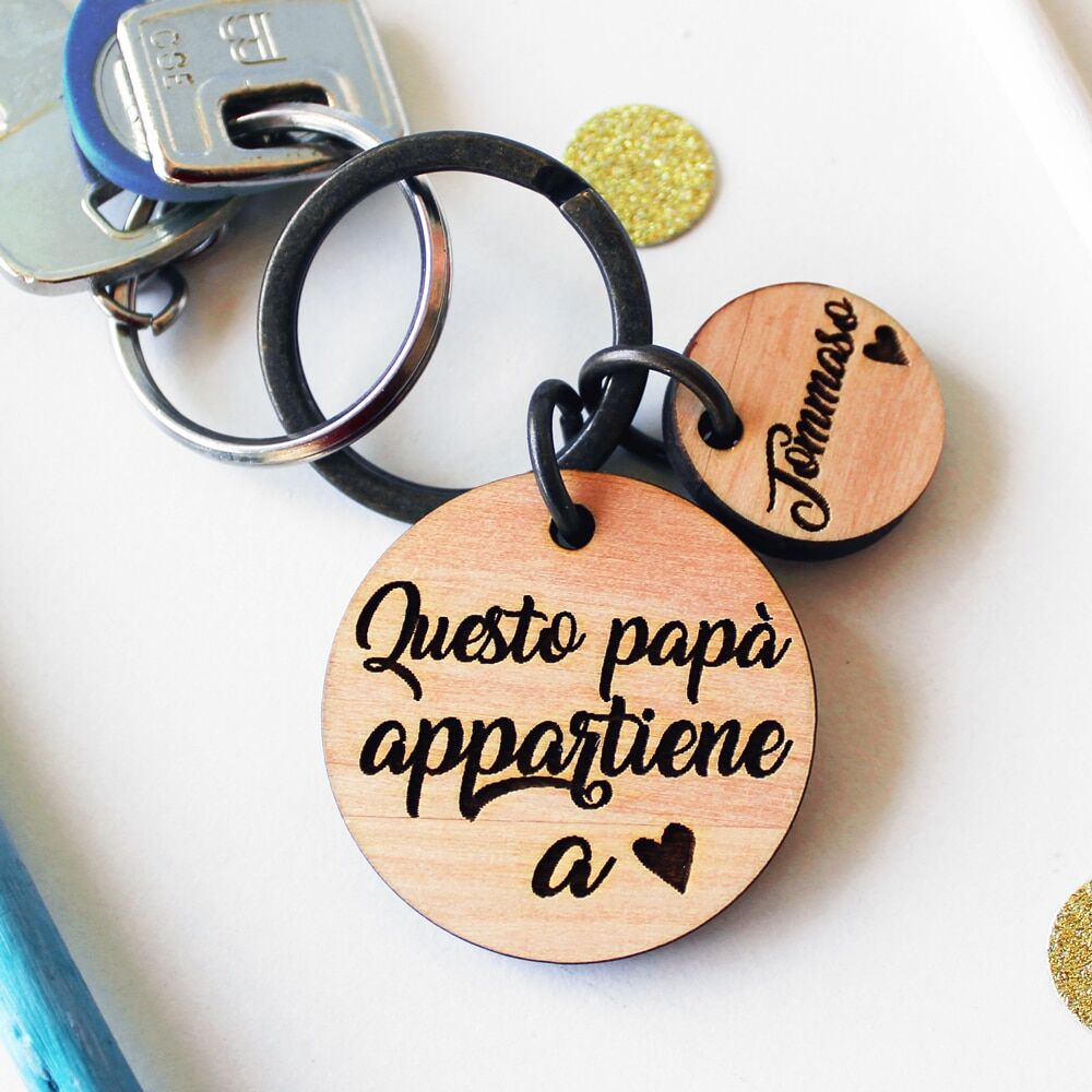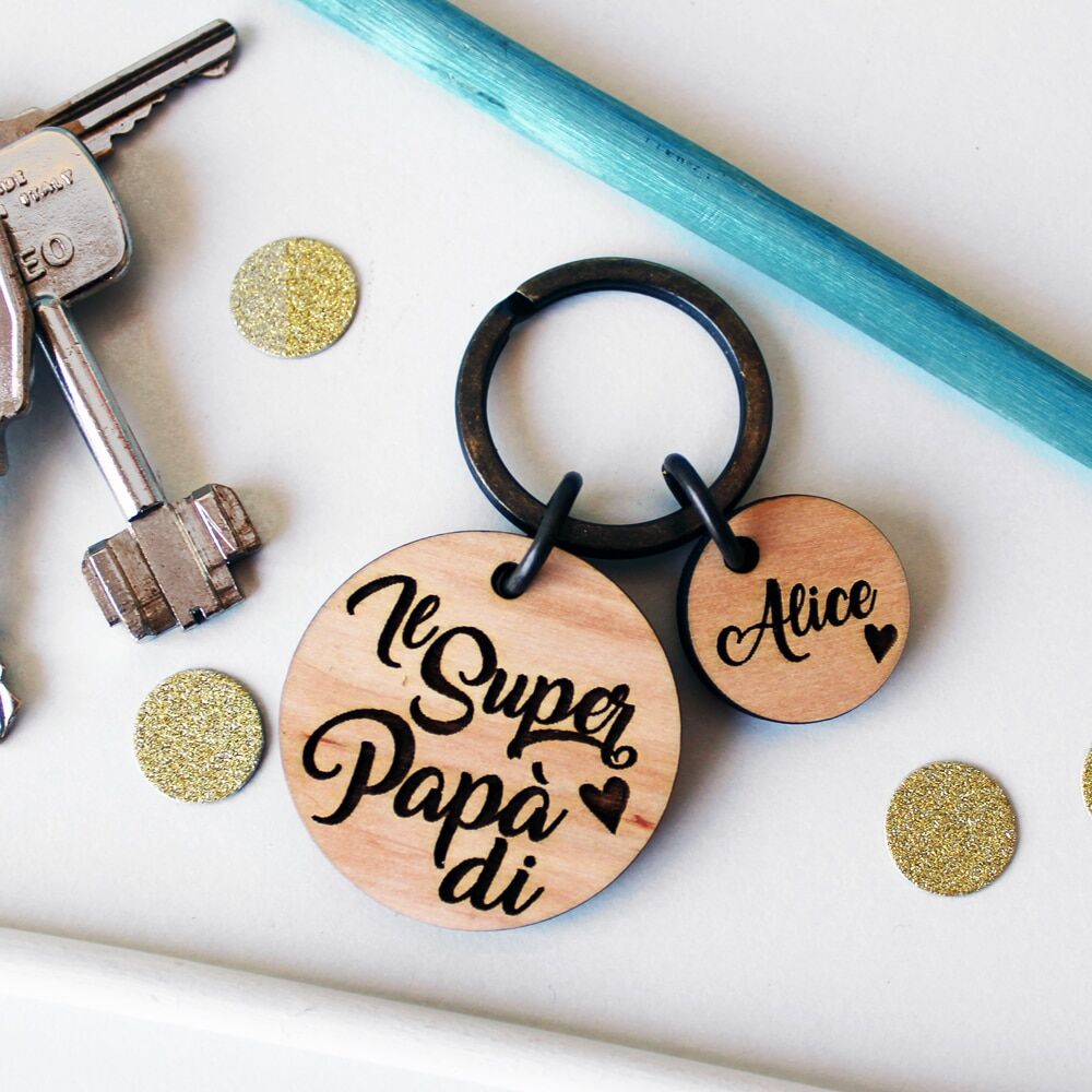 Dolcissimo portachiavi in legno personalizzato con la tua dedica e i nomi dei vostri piccoli incisi su charm. Una splendida idea regalo per la Festa del Papà: emozionatelo con questo portachiavi che gli ricorderà sempre quanto lo amiate!
