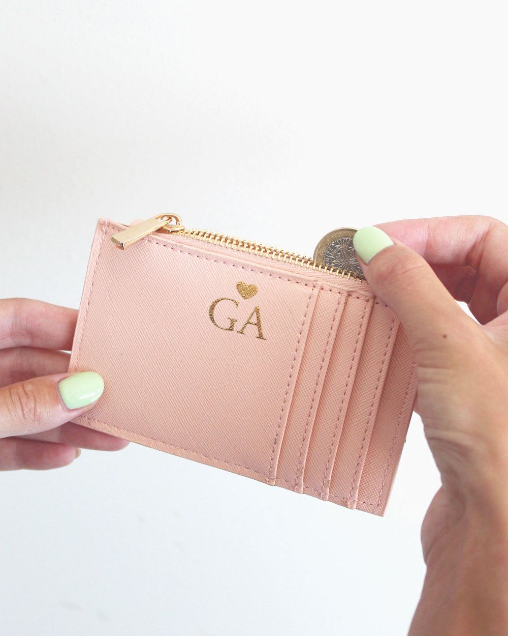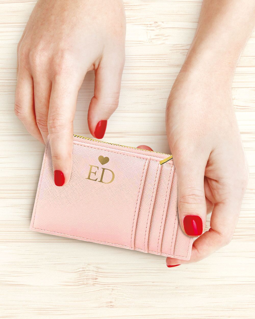 - Personalizzazione oro con iniziali e cuoricino: Ogni portatessera è reso unico dalla personalizzazione in oro con le iniziali e un cuoricino, dando un tocco extra di eleganza e personalità.