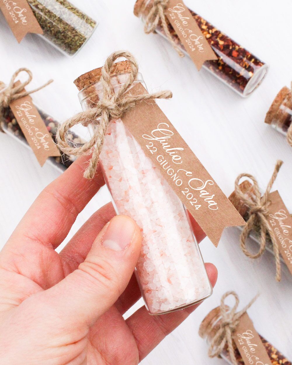 Provetta in vetro con tappo in sughero, nastro in corda e tag in carta. All’interno delle provette troverai spezie assortite (pepe rosa, peperoncino, sale rosa, mix di pepe, pepe verde, pepe nero e altre spezie in base alla disponibilità) con tag carta kraft perfette per matrimonio.