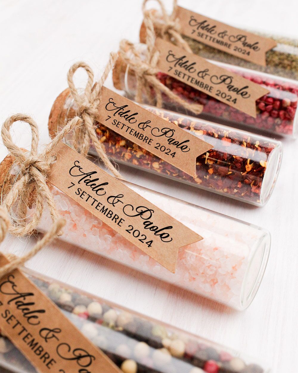 - Un Ricordo del Tuo Evento: Le provette porta spezie non sono solo bomboniere, ma veri e propri ricordi del vostro matrimonio. Ogni volta che i vostri ospiti useranno le spezie, penseranno a voi e al vostro giorno speciale. Questa idea bomboniera è il modo perfetto per condividere un pezzo della vostra felicità con chi ha partecipato alla vostra festa.