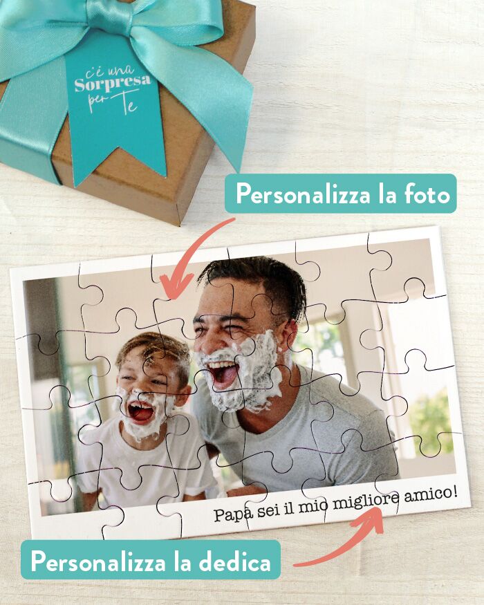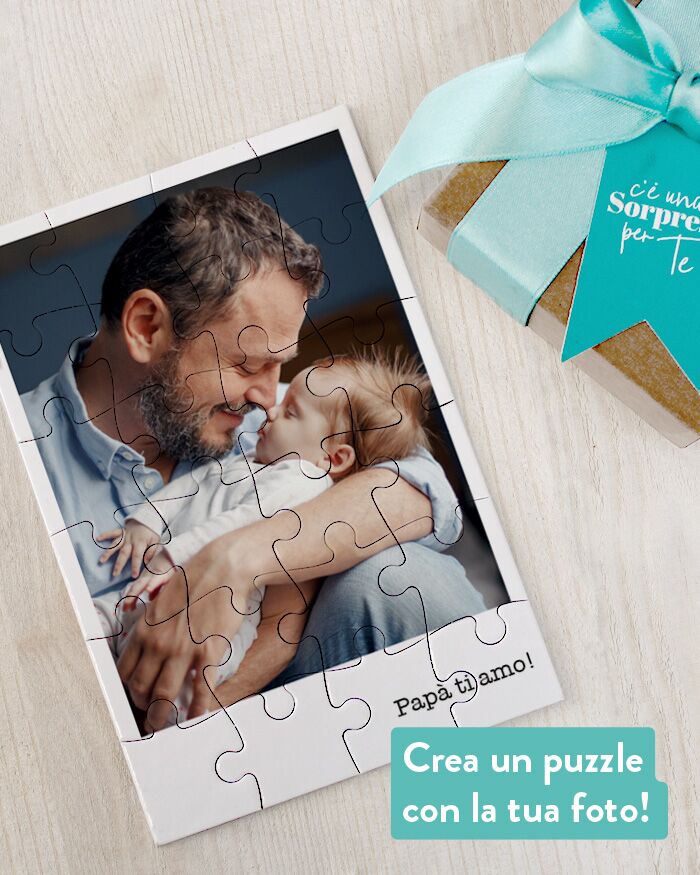 Quest’anno sorprendi il tuo papà il giorno della Festa del Papà con un puzzle da costruire insieme. Incastro dopo incastro comparirà la vostra foto e la tua dedica. Sarà un’emozione incontenibile!