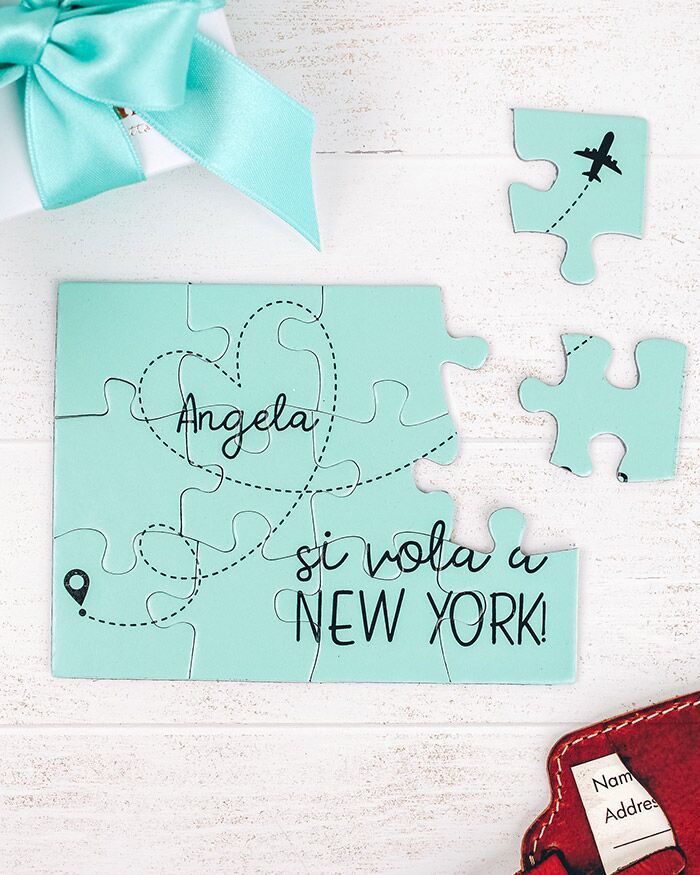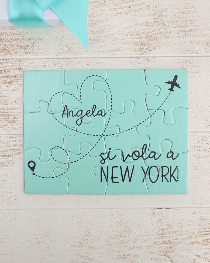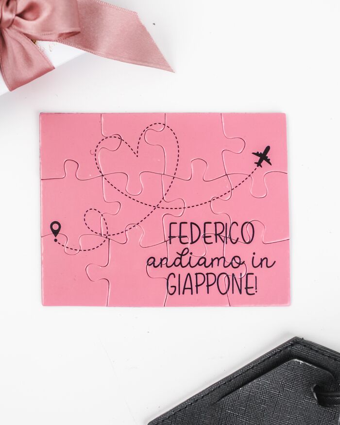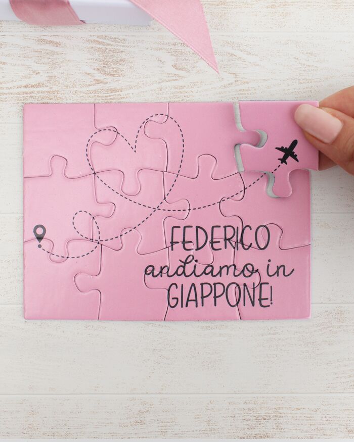 Simpaticissimo puzzle a sorpresa per annunciare al tuo compagno o fidanzato il prossimo viaggio, o per svelare alla tua migliore amica la meta del suo addio al nubilato! Il fortunato o la fortunata destinataria di questo regalo, una volta aperta la scatolina che contiene le tessere personalizzate, si divertirà a comporre il puzzle fino a che la frase non risulterà composta e leggibile. L’effetto sorpresa è assicurato, come siamo sicuri, anche la risposta: non resta altro che partire!