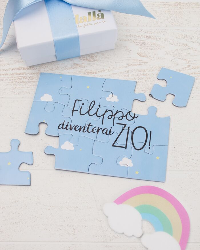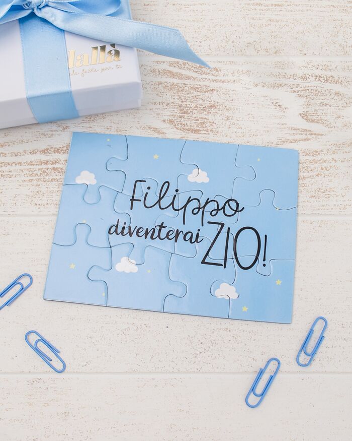 Dolcissimo puzzle a sorpresa per annunciare a fratelli e sorelle la nascita del nipotino o nipotina. I futuri zii, una volta aperta la scatolina che contiene le tessere personalizzate, si divertiranno a comporre il puzzle fino a che la frase non risulterà composta e leggibile. L’effetto sorpresa è assicurato, come anche le lacrime di gioia che seguiranno!