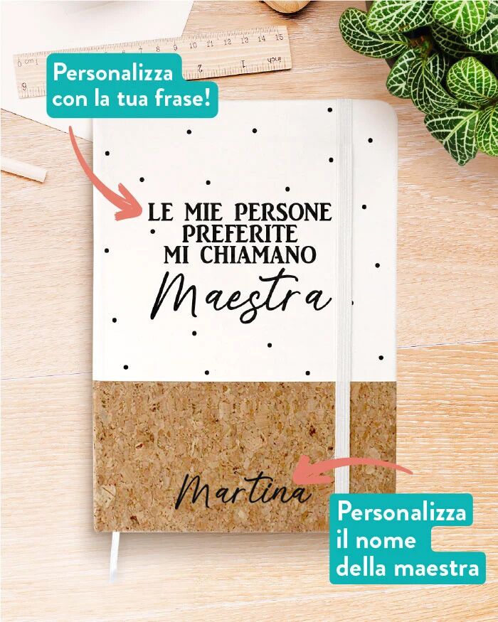 - UN QUADERNO PERSONALIZZABILE con il nome della maestra e una vostra speciale dedica di classe, che l’insegnante potrà utilizzare per annotare appunti e impegni quotidiani.