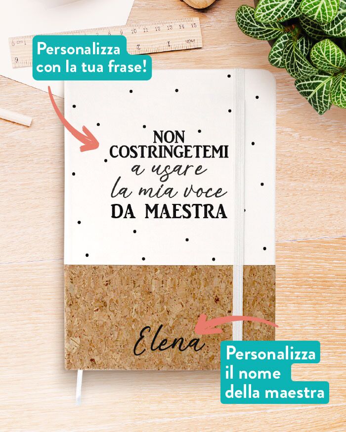 L’insegnante dei tuoi bimbi merita un ringraziamento per il prezioso lavoro che svolge ogni giorno con i tuoi piccoli. E quale miglior modo di farlo se non affidarsi a un regalo personalizzato che possa utilizzare tutti i giorni? Questo quaderno sarà sicuramente un valido aiuto in tutte le attività quotidiane di una Maestra. Lo potrà utilizzare per segnare nella sua fiammante agenda nuova i compiti, gli appunti, o quando lo userà per prepararsi la lezione da proporre in classe!