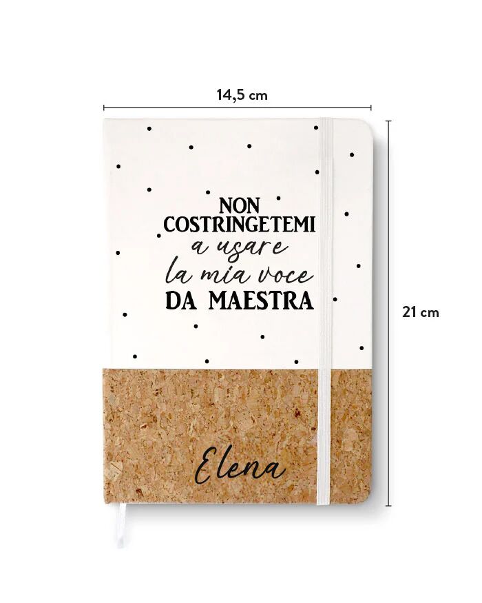 Elegante quaderno con dedica “Non costringetemi ad usare la mia voce da Maestra”, personalizzabile con una dedica ed il nome della tua maestra. Un fantastico regalo di classe per ringraziarla per la fine dell’anno scolastico!