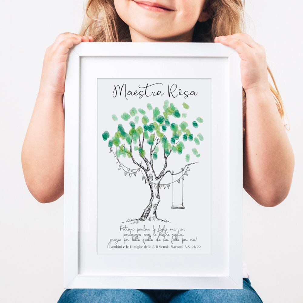 Carinissimo Quadretto per le Maestre con Dedica e le impronte digitali dei bimbi. Regala un’emozione unica alle insegnanti dei tuoi bimbi con questo bellissimo quadretto, dove è possibile scrivere una dolce dedica e coinvolgere i bambini nella realizzazione delle piccole impronte digitali, che vanno a creare le foglioline dell’albero! Sarà un regalo ancora più sentito e affettuoso grazie alla compartecipazione dei bambini, le maestre ne saranno davvero commosse!