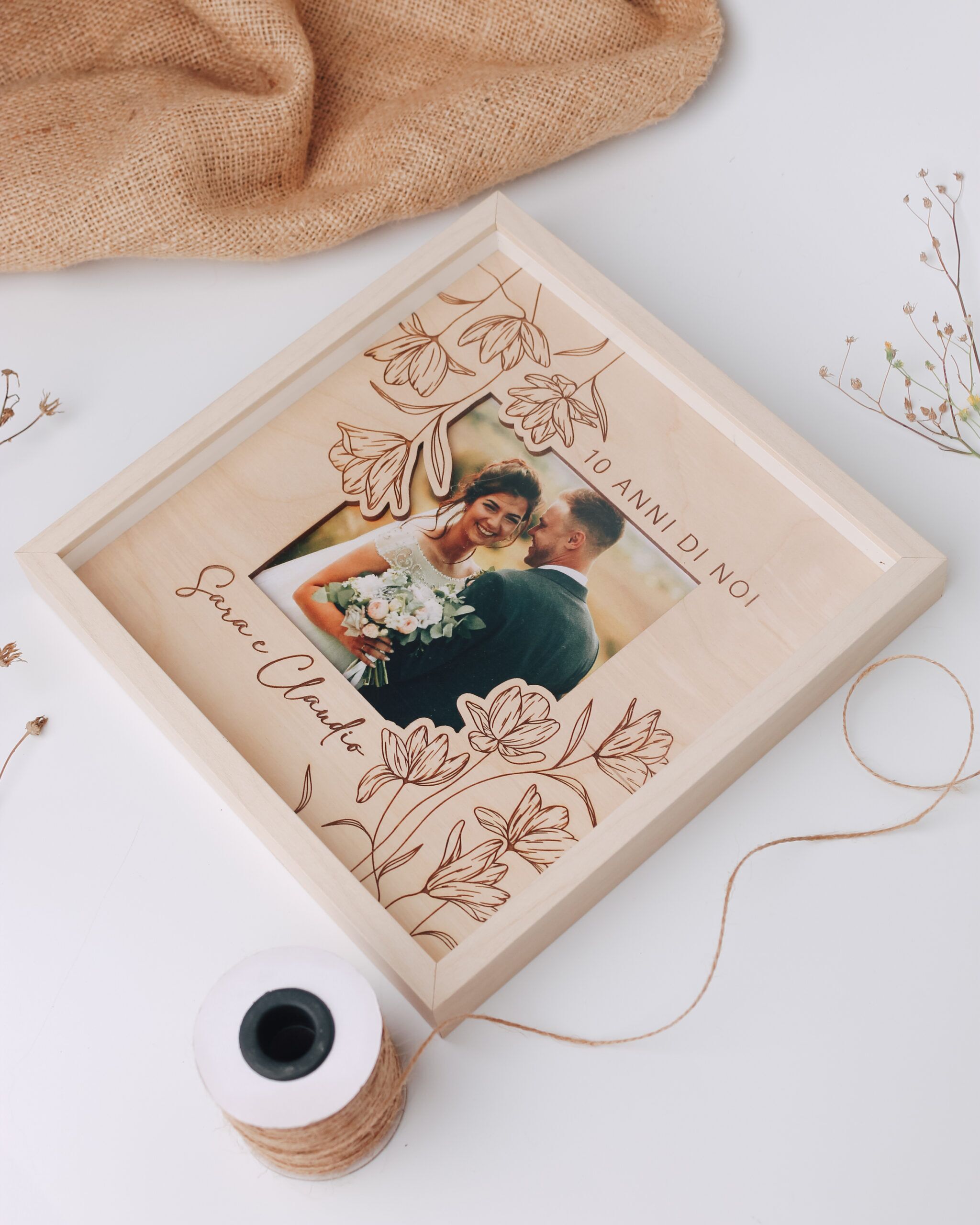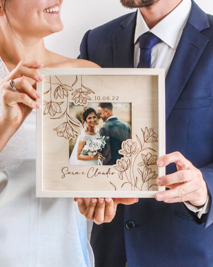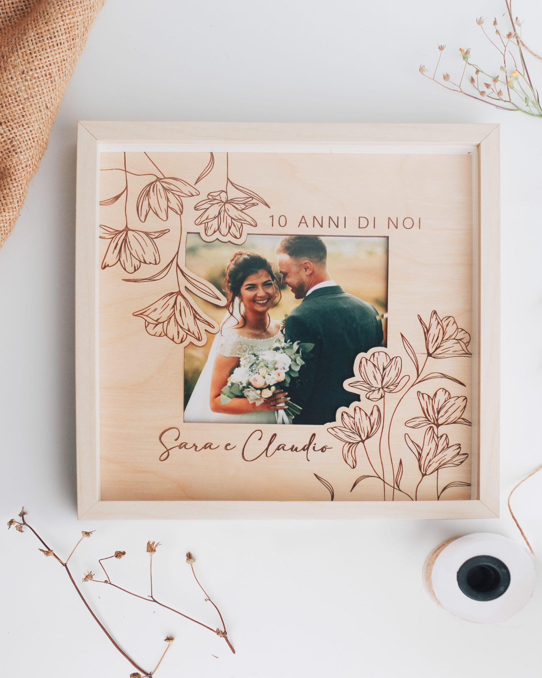 Questo bellissimo quadretto è perfetto per un regalo di anniversario da fare alla propria moglie o al proprio marito, o perché no a una coppia di amici che festeggia il primo anniversario di matrimonio. Il dettaglio dei fiori incisi è perfetto per stupire ogni coppia.