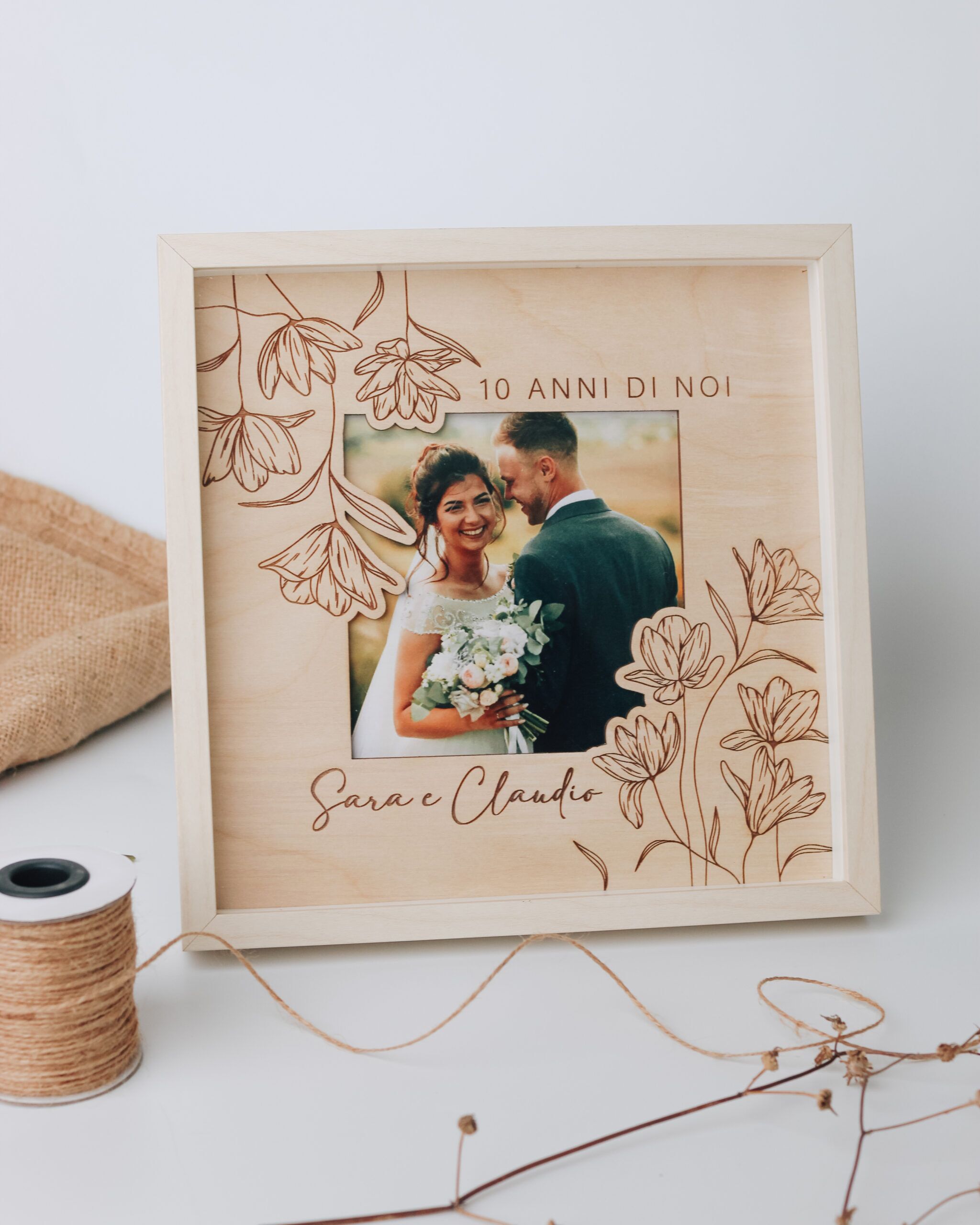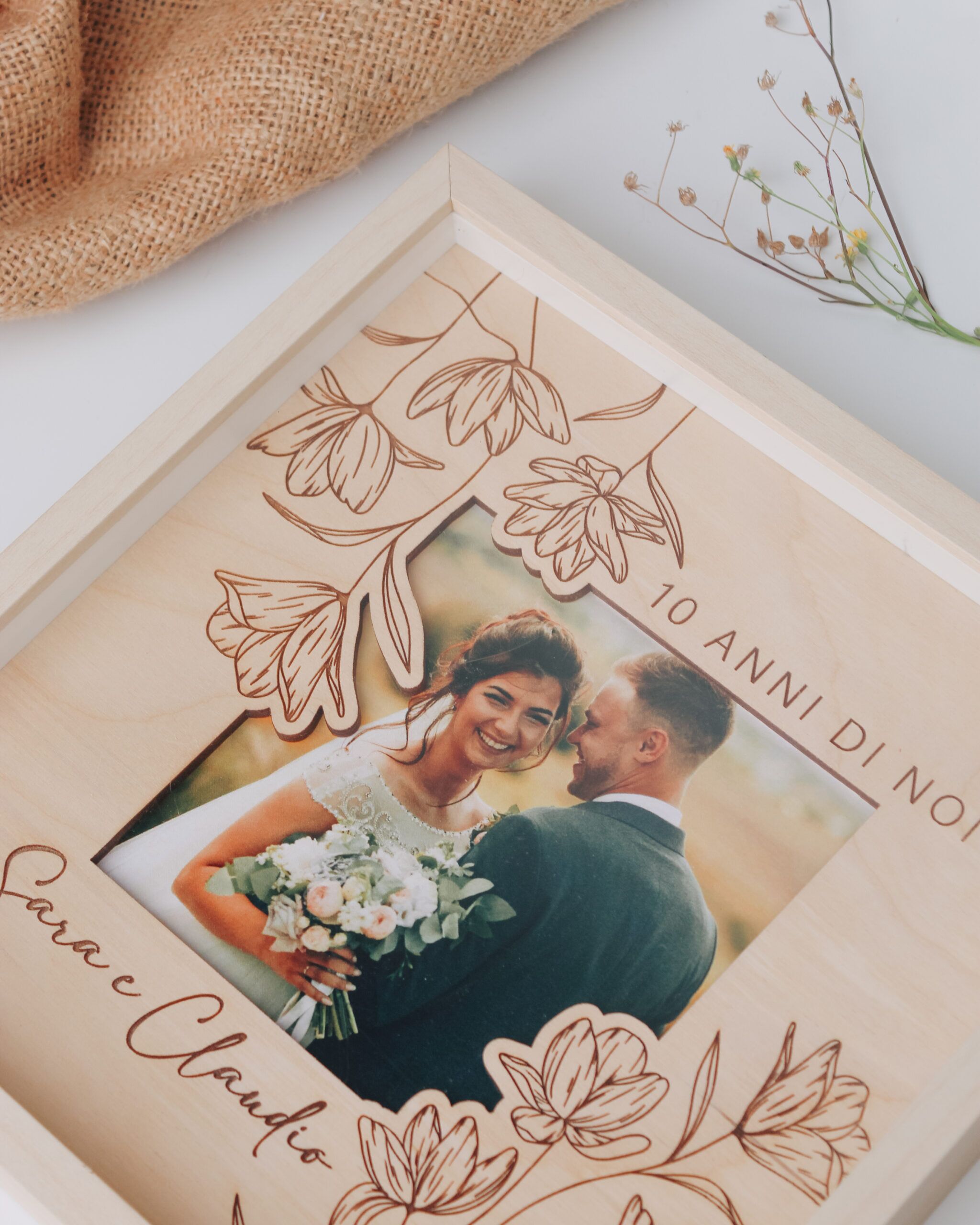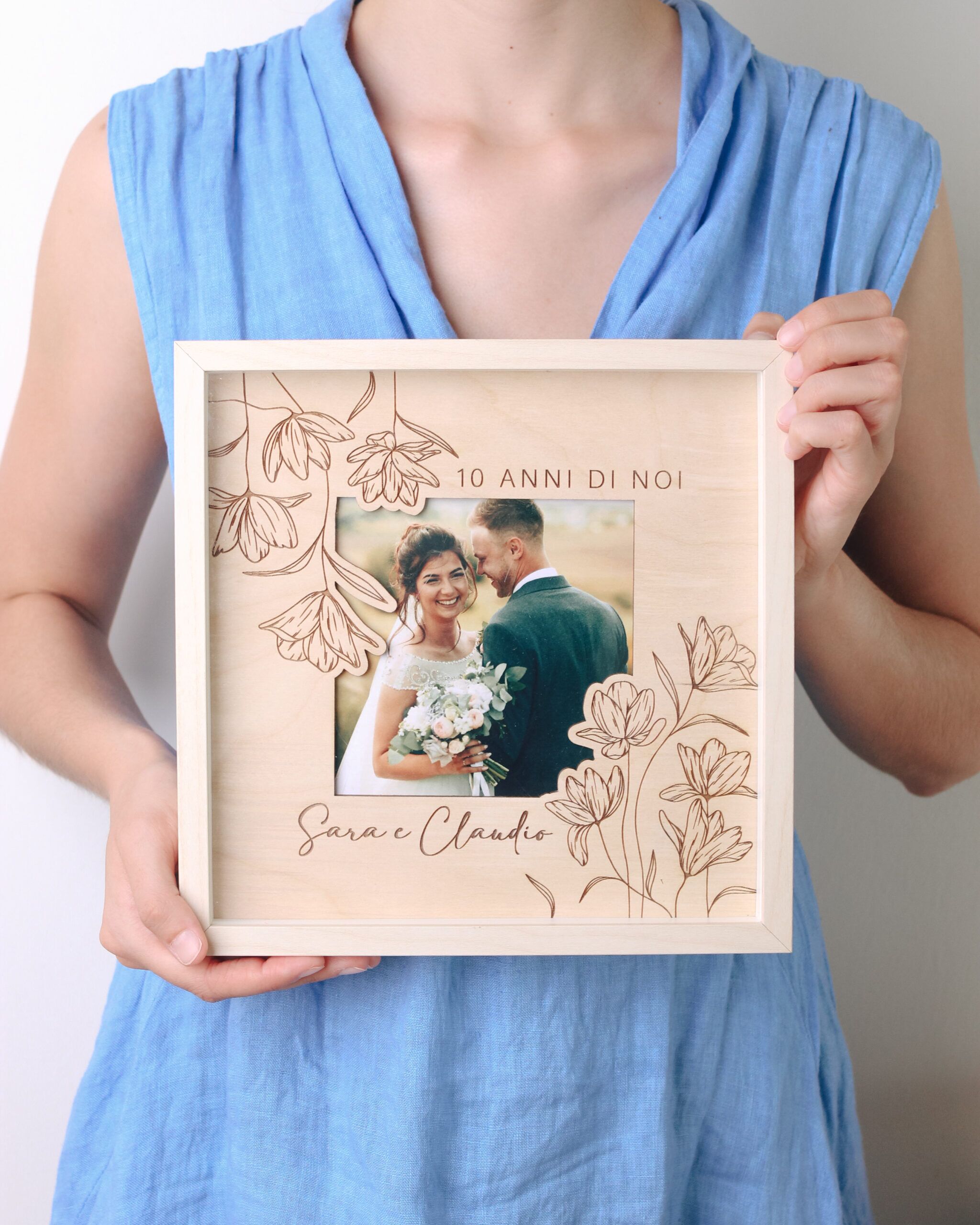 Questo bellissimo quadretto è perfetto per un regalo di anniversario da fare alla propria moglie o al proprio marito, o perché no a una coppia di amici che festeggia il primo anniversario di matrimonio. Il dettaglio dei fiori incisi è perfetto per stupire ogni coppia.