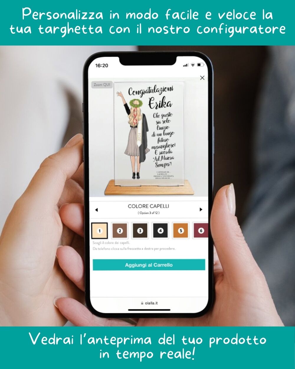 PERSONALIZZAZIONE: Per personalizzare la targhetta ti basterà aprire il personalizzatore online e seguire passo passo le finestre di personalizzazione: scorri con le frecce e scegli ogni dettaglio, dal colore della pelle, la pettinatura, l’outfit, arrivando fino alla dedica e al nome del corso di studi. Vedrai, personalizzare un regalo non è mai stato così semplice!