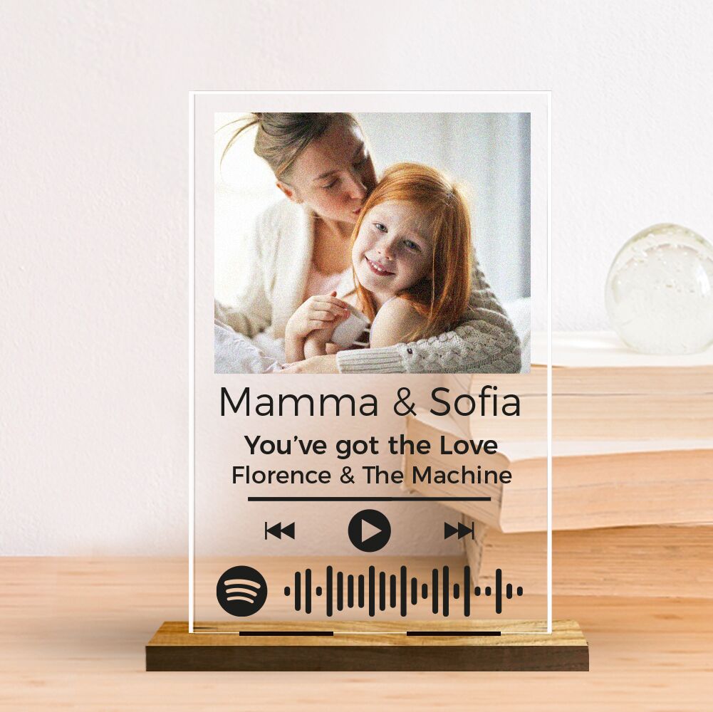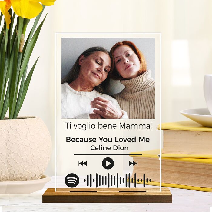 Bellissima Targhetta in plexiglass trasparente personalizzabile con la vostra foto, i nomi e il codice Spotify della vostra canzone. Regala un’emozione unica alla tua mamma e stupiscila nel giorno della sua festa.