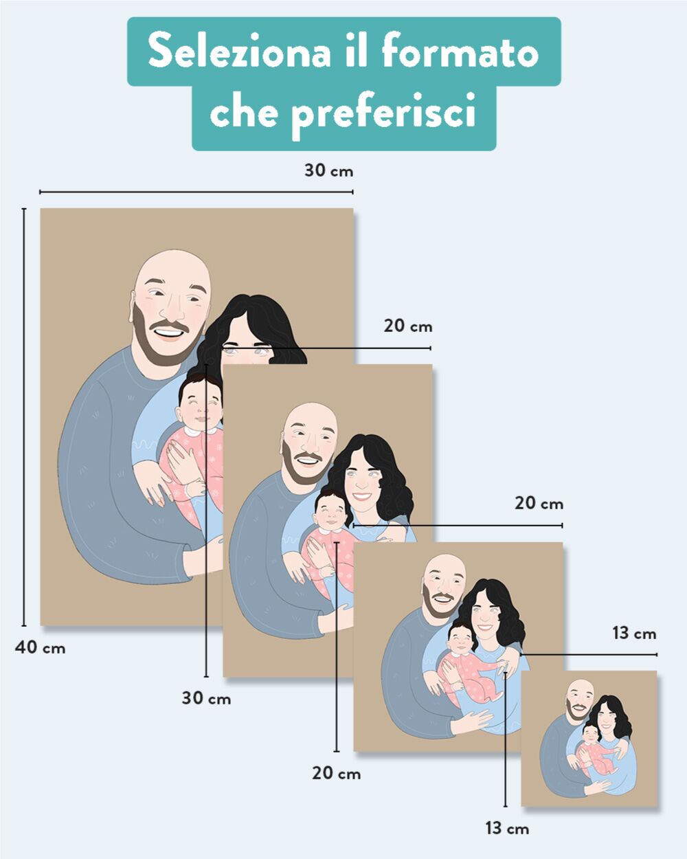 Il ritratto può essere realizzato in vari formati, ti basterà scegliere il tuo preferito dal menu di scelta. Infine potrai anche ricevere il tuo ritratto già incorniciato scegliendo tra le varie opzioni di cornici disponibili.