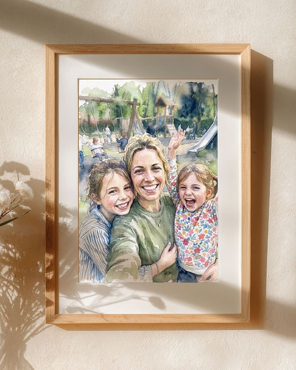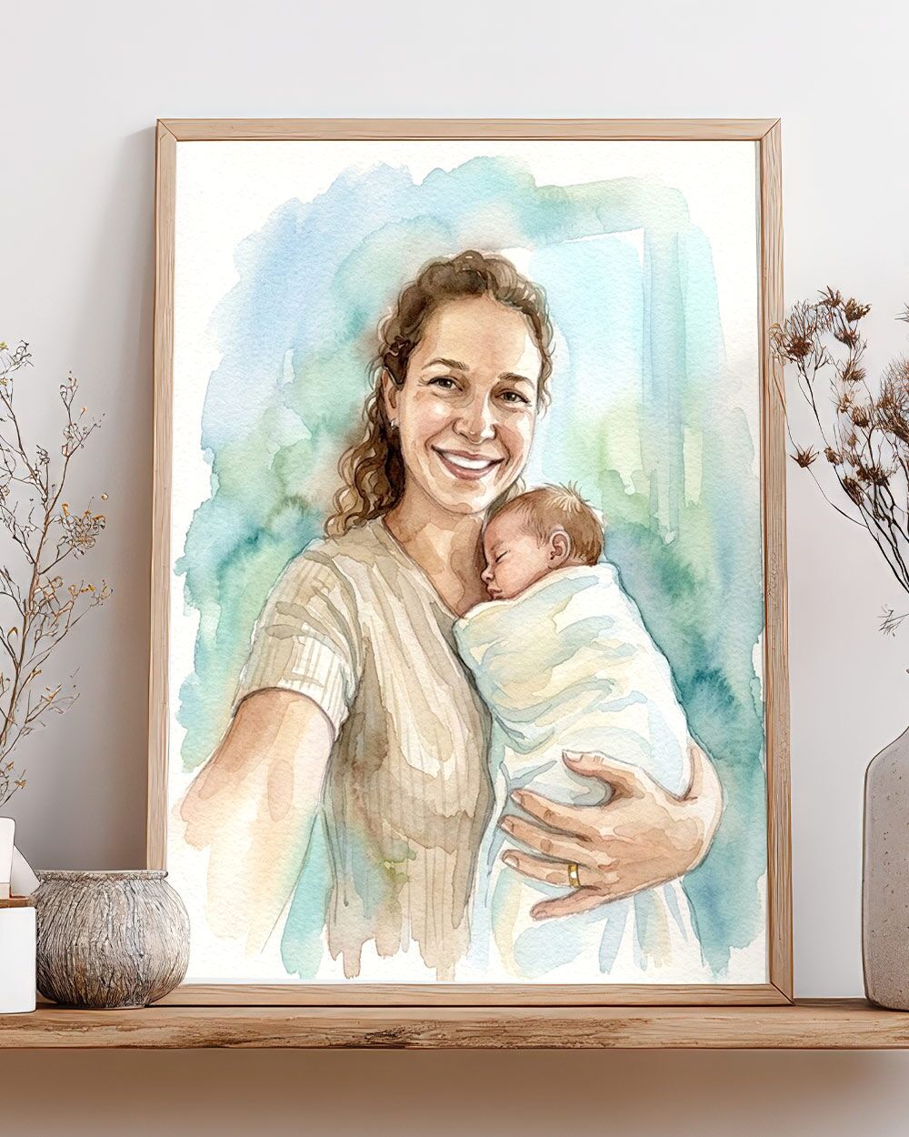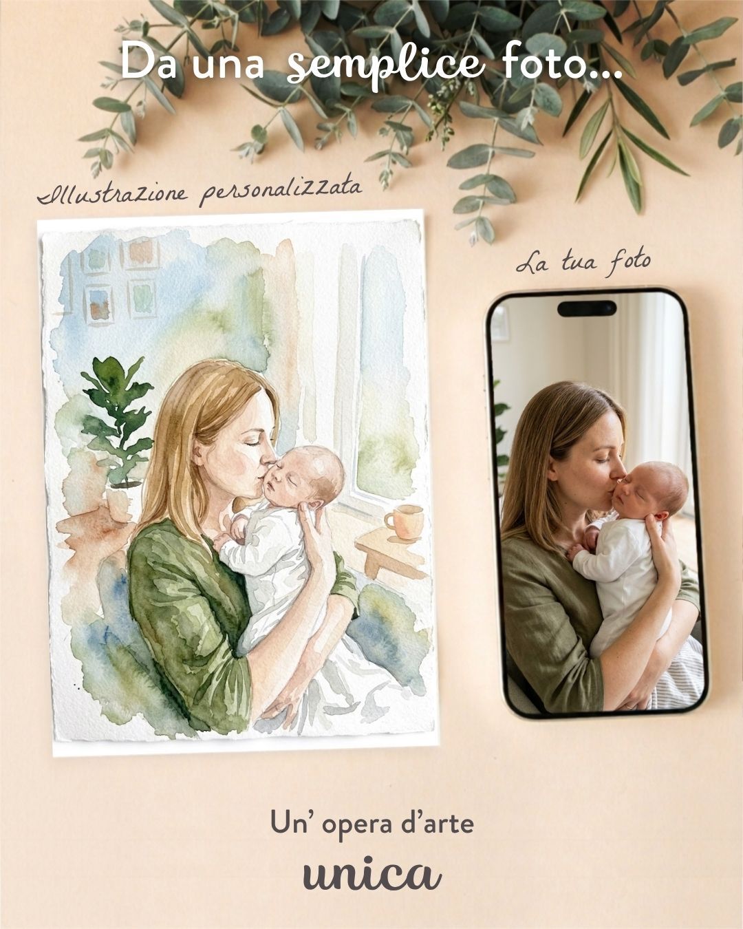 Il ritratto effetto acquerello è pensato per chi vuole fare un dono che emozioni davvero — qualcosa che vada oltre il classico mazzo di fiori o la candela profumata. È il regalo perfetto per la mamma che ama le cose belle e significative: il suo ritratto, quello di un figlio, o di tutta la famiglia trasformato in arte.