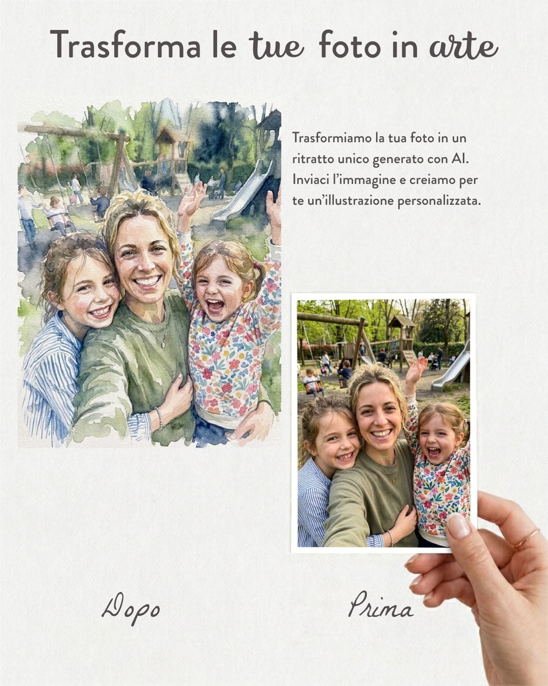 Sì, puoi caricare una foto di gruppo o di coppia. L’illustrazione effetto acquerello funziona molto bene anche con 2-3 persone nello stesso ritratto — è anzi una delle combinazioni più richieste per la Festa della Mamma (mamma con figli, nonna con nipoti, ecc.).