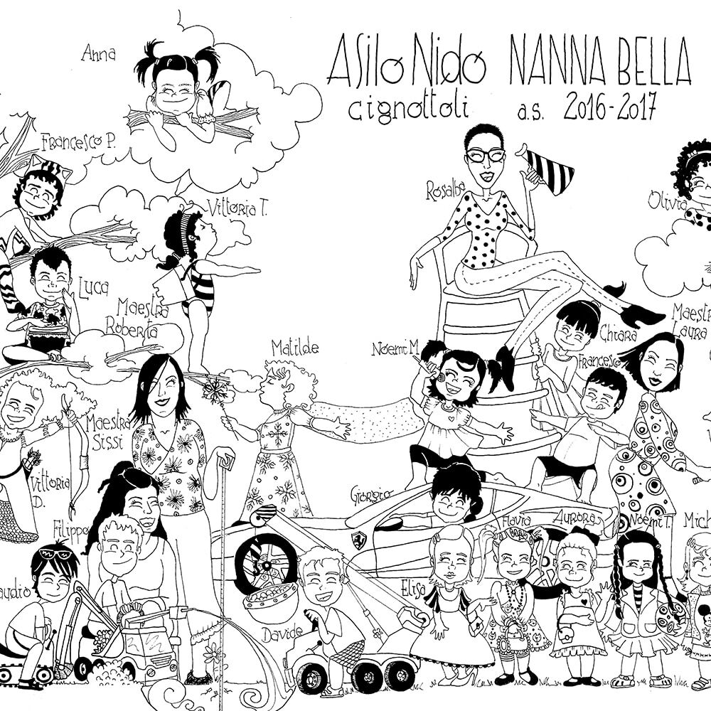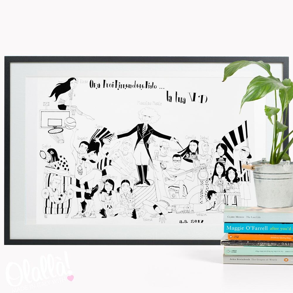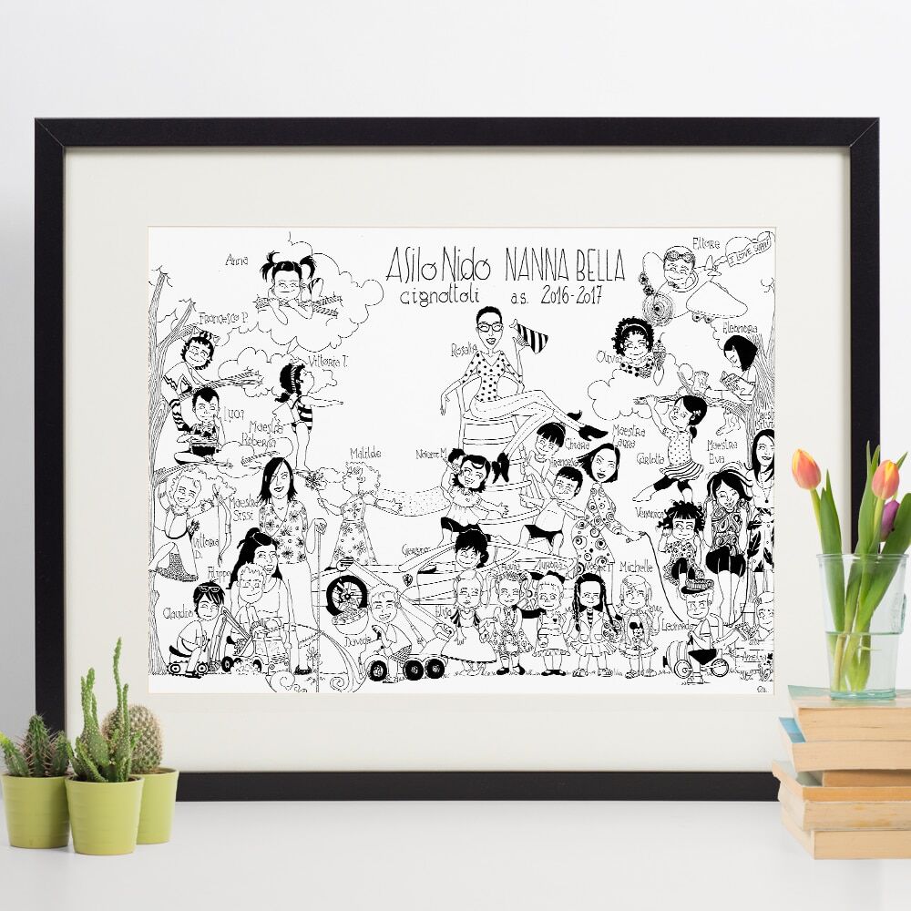 Il vostro ritratto sarà eseguito digitalmente da una bravissima illustratrice, sulla base delle vostre indicazioni. I bimbi verranno ritratti in un insieme armonico rappresentativo della loro classe, in modo anche se possibile da riprendere come tema il nome della scuola. Se desiderato, sul ritratto può essere riportata una vostra scritta a piacere, personalizzando ciascuna volta la stampa con il nome della maestra a cui desiderate donarla.